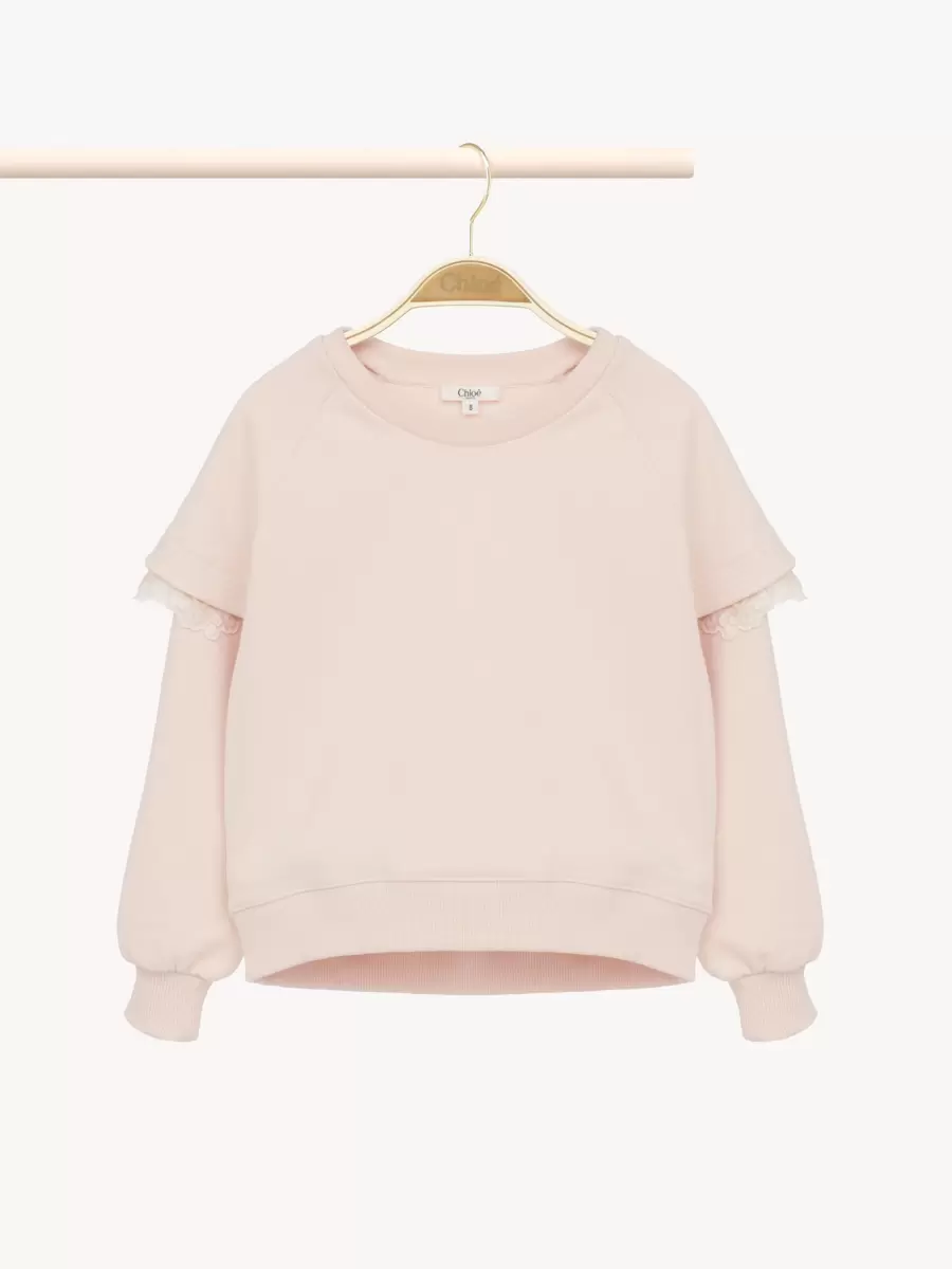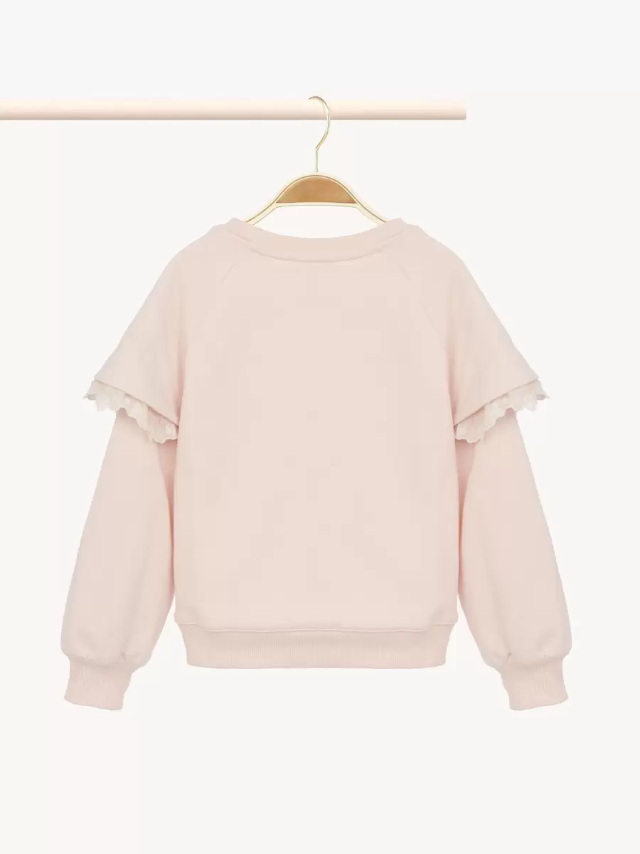 Questo maglione in cotone biologico esalta il morbido e confortevole pile con un volant smerlato impreziosito da ricami floreali sulle maniche. La silhouette rilassata a girocollo è rifinita con bordi a coste.
