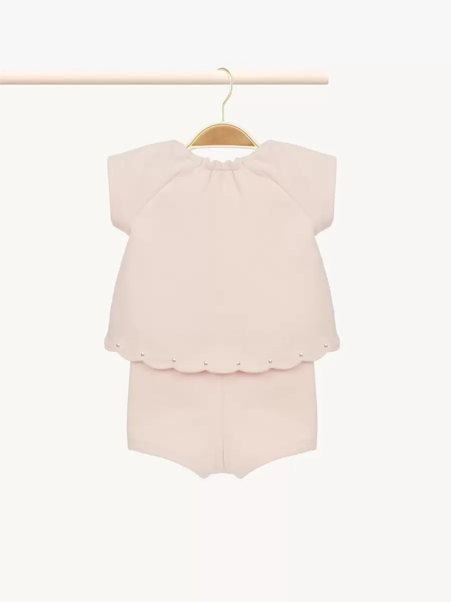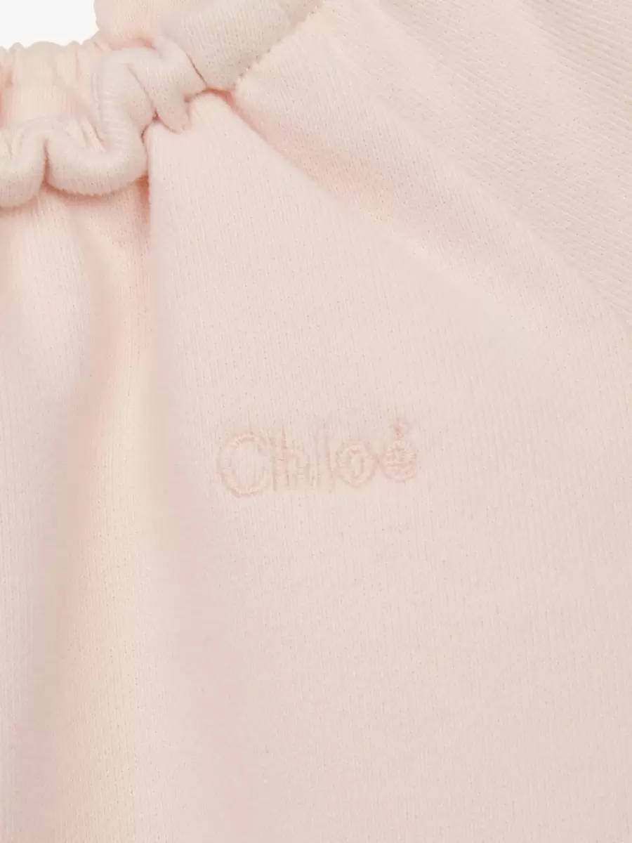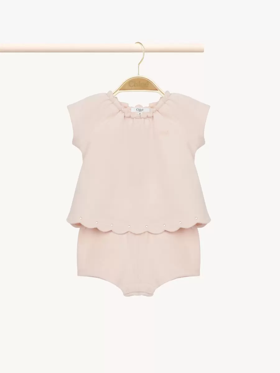 Realizzata in pile di cotone biologico, questa tutina per neonato combina un collo elasticizzato con un orlo smerlato impreziosito da strass. Il logo Chloé tono su tono è ricamato sul petto.