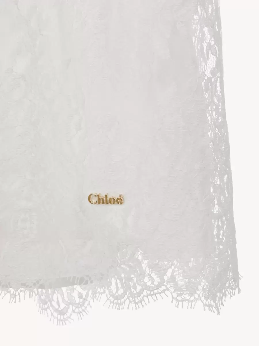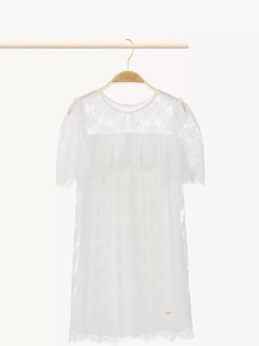 Realizzato in pizzo francese di Calais foderato in twill di viscosa, questo abito a maniche corte presenta una balza sul petto per una silhouette affascinante, radicata nel DNA della Maison. Una targhetta con logo Chloé color oro sull’orlo firma questo capo in edizione limitata.