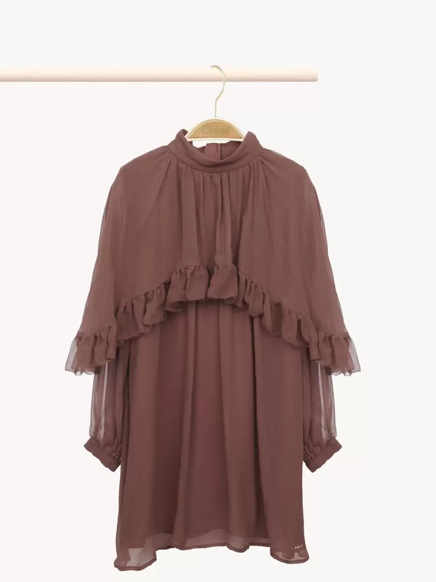 Realizzato in crêpe di seta foderato in twill di viscosa, questo abito da cerimonia a maniche lunghe ha una silhouette fluida impreziosita da volant lungo il petto e le maniche. Bottoni dorati con incisione Chloé decorano i polsini, mentre una targhetta con logo Chloé dorato firma l’orlo.