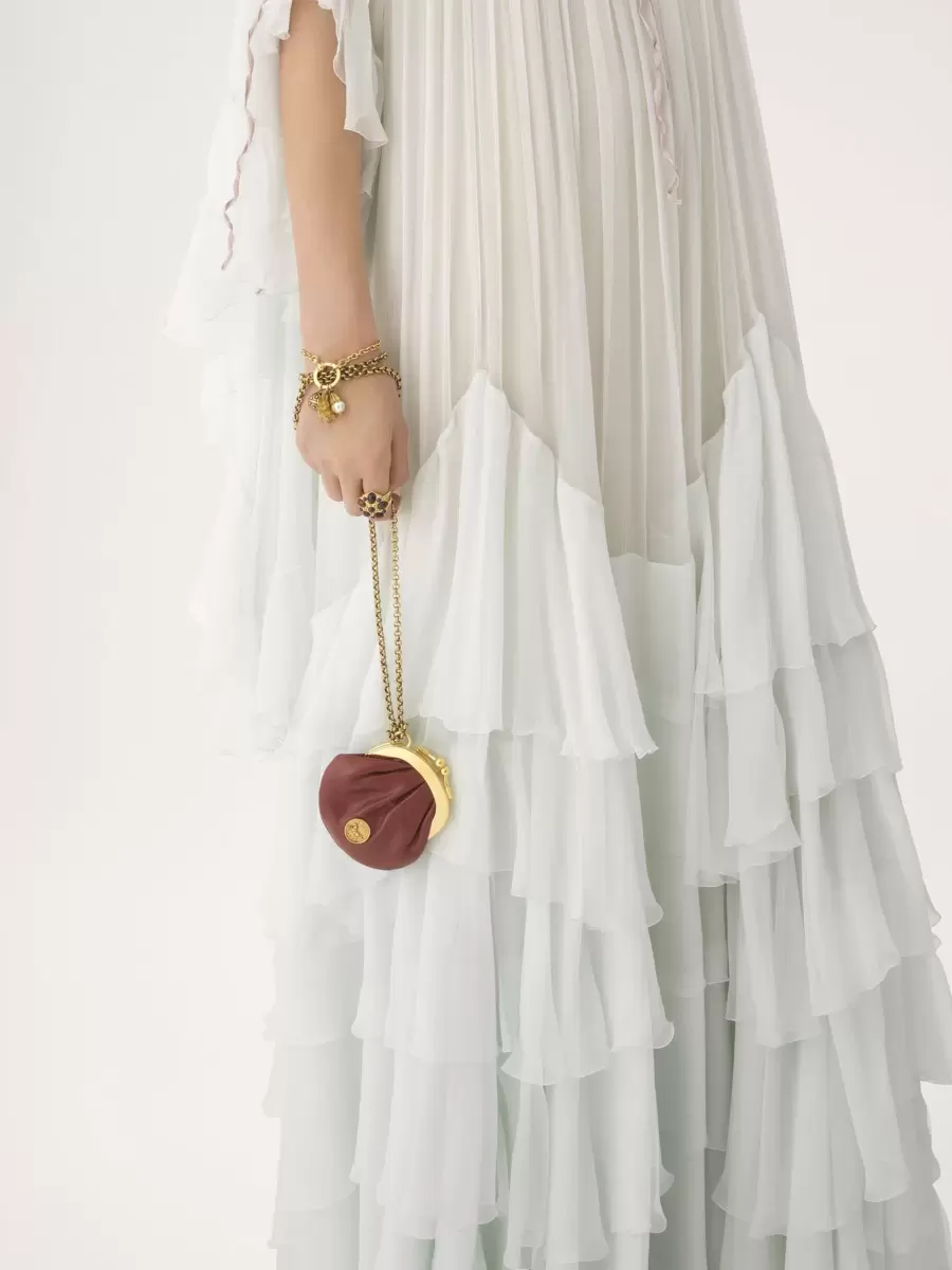 Questo micro portamonete Horse Medal è realizzato in pelle di bufalo granata, con chiusura color oro e tracolla a catena rimovibile. La parte anteriore è impreziosita dall’iconica medaglia della Maison con l’immagine in rilievo di un cavallo al galoppo e l’incisione del logo Chloé Paris.