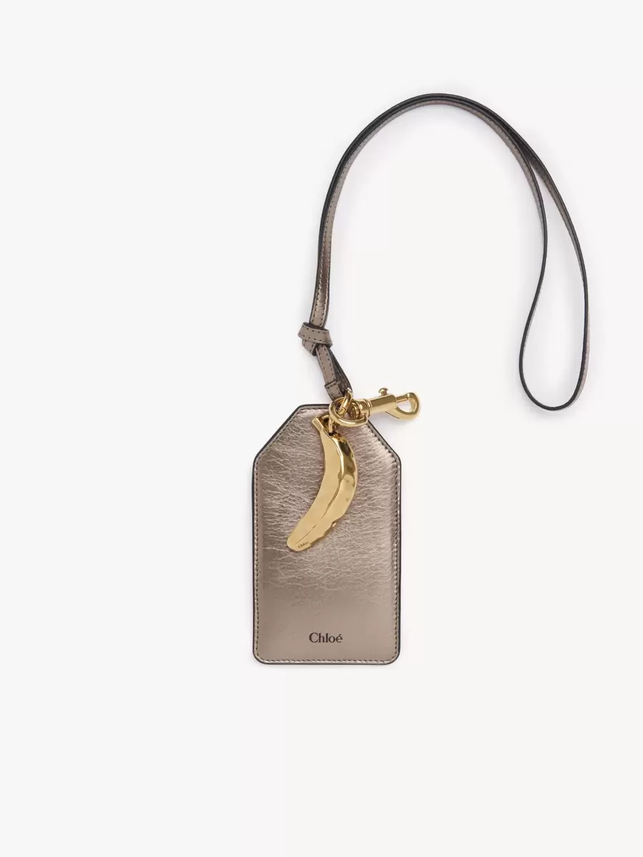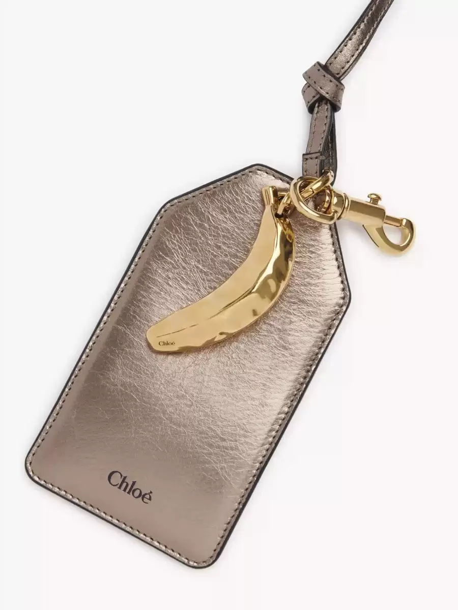 Realizzata in pelle di vitello metallizzata, questa targhetta Chloé Symbols Banana è impreziosita da un giocoso ciondolo in ottone vintage, omaggio alla collezione Primavera 2001 della Maison. La targhetta è dotata di quattro scomparti per carte, un gancio e una chiusura a laccio.