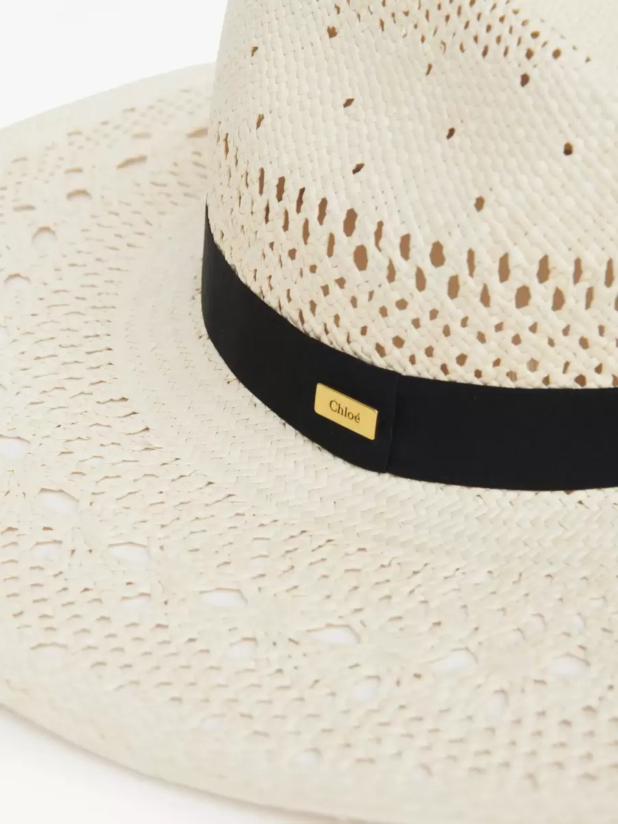 Cappello Panama Chloé in paglia di palma toquilla con perforazioni effetto pizzo. Un nastro di seta a contrasto contorna la base, firmata da una targhetta con logo Chloé color oro.