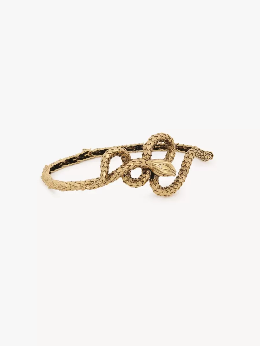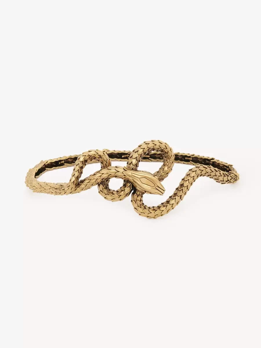 Cintura gioiello Chloé Snake presentata in passerella, ispirata al ricamo di un abito Chloé d’archivio. Grandi squame, una forma a spirale e una raffinata testa di serpente rendono questa cintura un pezzo scultoreo e distintivo. Un mix di tonalità oro e nero crea texture. Regola la catena per indossare la cintura alta in vita o bassa sui fianchi, a seconda della tua silhouette.