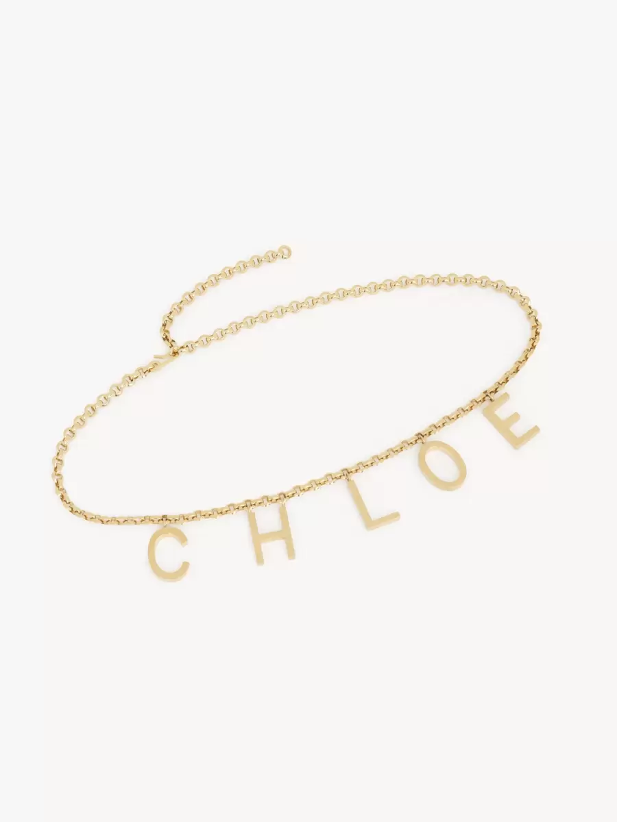Cintura gioiello Chloé Letters in ottone dorato vintage, che esprime la firma Chloé attraverso i ciondoli a forma di lettera. La catena regolabile ha una chiusura a gancio.