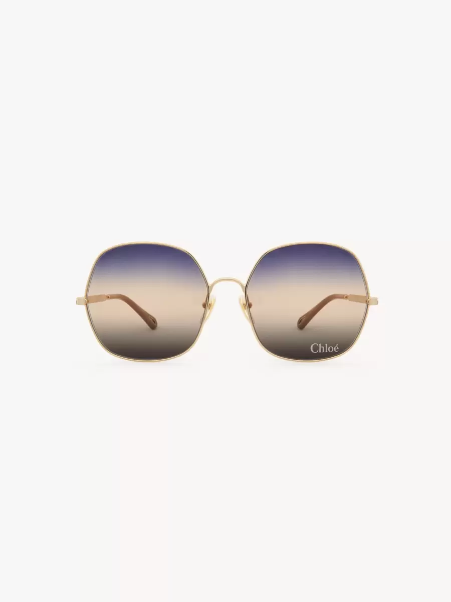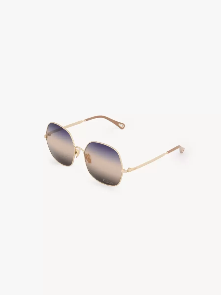 Questi occhiali da sole quadrati Aly abbinano una montatura grafica leggera in metallo dorato lucido a lenti triple sfumate in una palette di blu, beige e marrone. Il logo Chloé rifinisce la lente sinistra.