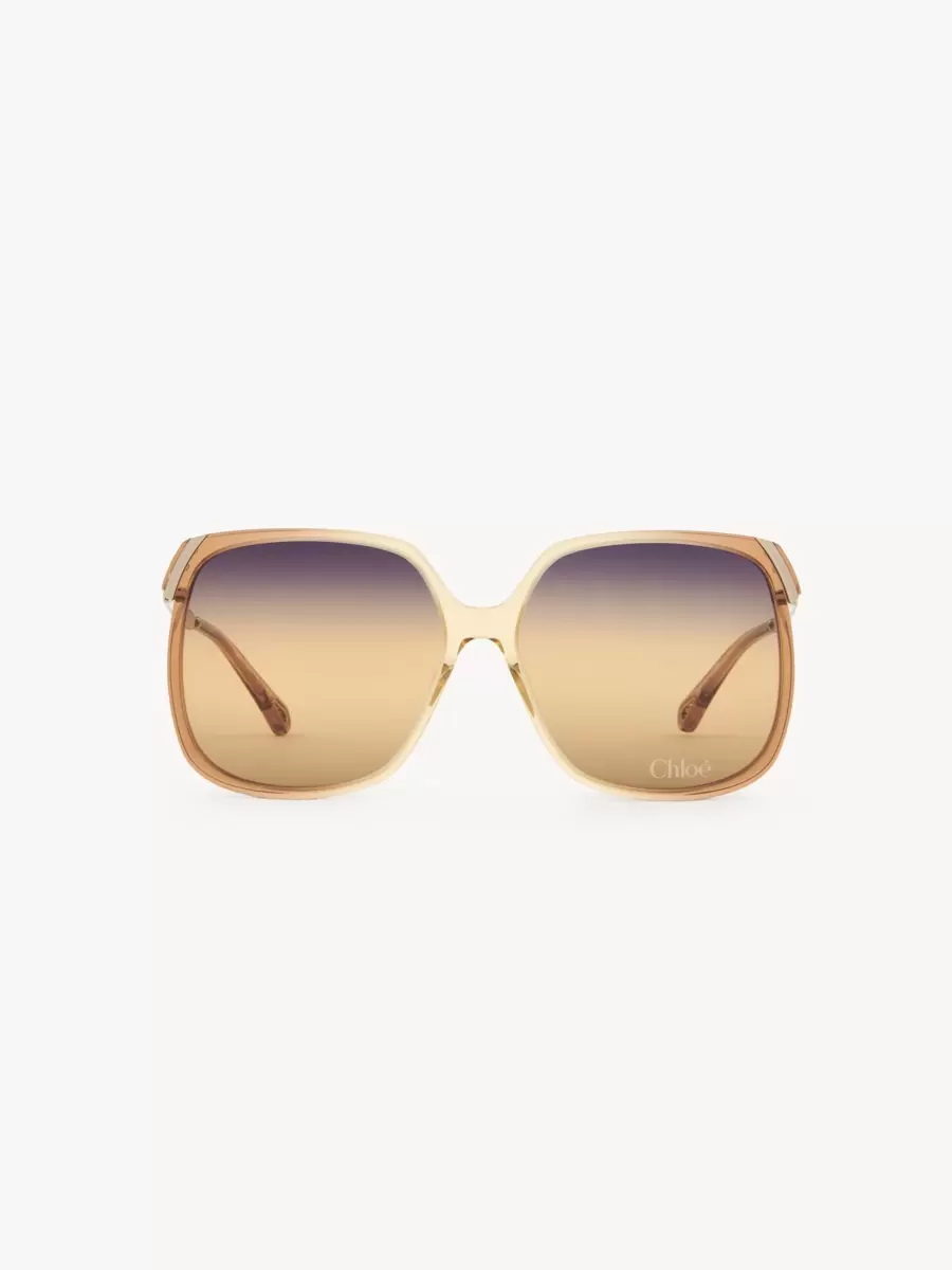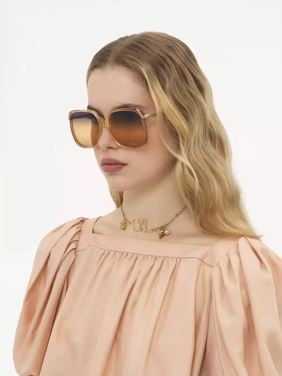 Questi occhiali da sole quadrati Aly hanno una montatura in stile anni ’70 in un mix di acetato trasparente ocra a basso impatto e metallo dorato lucido. Le lenti a tripla sfumatura viola, miele e marrone sono firmate con il logo Chloé.