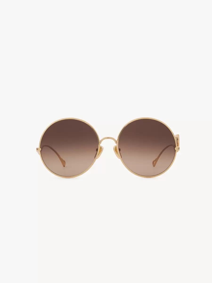 Ispirati alla tradizione della Maison, questi occhiali da sole rotondi Chloé Iconic abbinano una montatura leggera in metallo dorato chiaro lucido a lenti oversize sfumate marroni. L’asta sinistra è impreziosita da un inserto con il logo Chloé Iconic.