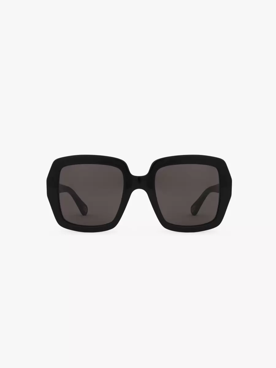 Questi occhiali da sole quadrati Marcie abbinano una montatura nera lucida in acetato a basso impatto con lenti grigio tinta unita. L’elemento in metallo dorato, simbolo della linea, impreziosisce le aste.