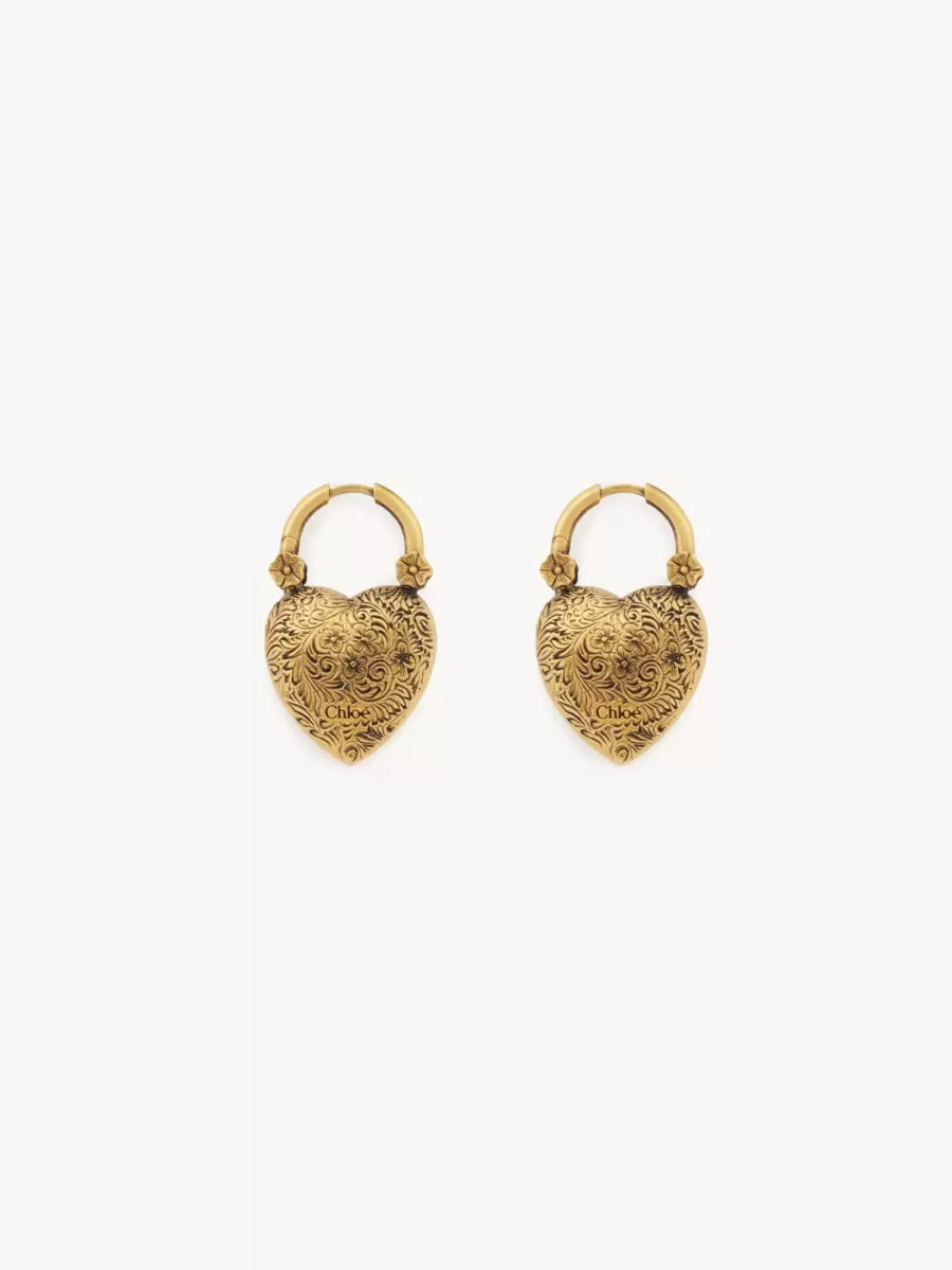 Orecchini Château Treasures in ottone dorato vintage, con piccoli pendenti ornamentali a forma di cuore firmati con l’incisione del logo Chloé.