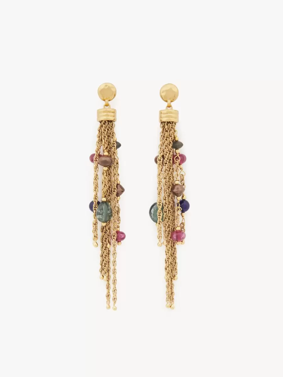 Orecchini Chloé Pompoms in ottone dorato vintage, perle sintetiche e cristallo. In un gioco di texture e materiali, le nappe a catena, meticolosamente assemblate a mano, sono impreziosite da perle sintetiche multicolori e cristallo in un design asimmetrico. L’incisione del logo Chloé completa questi orecchini.