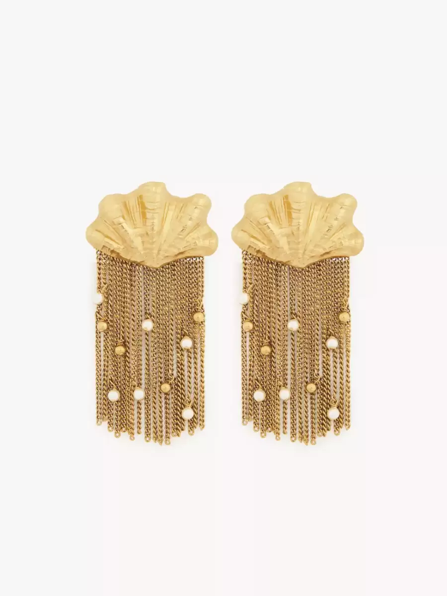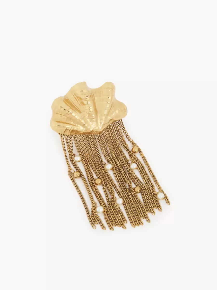 Orecchini Chloé Shells in ottone dorato vintage. Le grandi conchiglie sono impreziosite da catene pendenti e perle sintetiche per una varietà di texture. L’incisione del logo Chloé completa questi orecchini.
