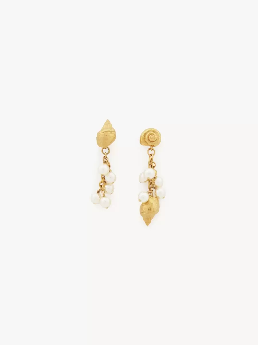 Piccoli orecchini pendenti Chloé Shells in ottone dorato vintage. Tre conchiglie e numerose perle sintetiche impreziosiscono il design asimmetrico, firmato dall’incisione del logo Chloé.