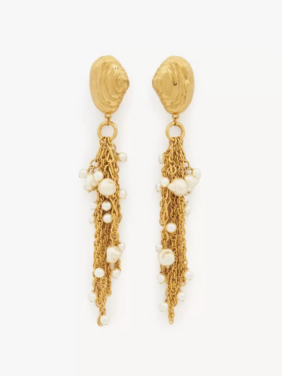 Orecchini pendenti Chloé Shells in ottone dorato vintage. I perni a conchiglia testurizzati sono abbinati a nappe a catena impreziosite da perle sintetiche di varie forme e dimensioni. L’incisione del logo Chloé completa questi orecchini.