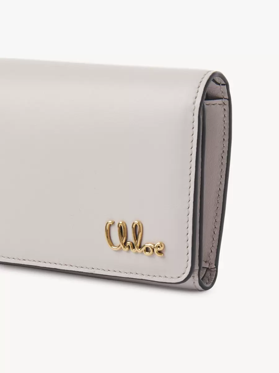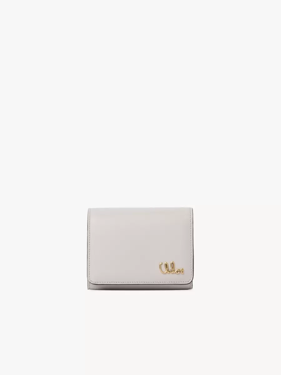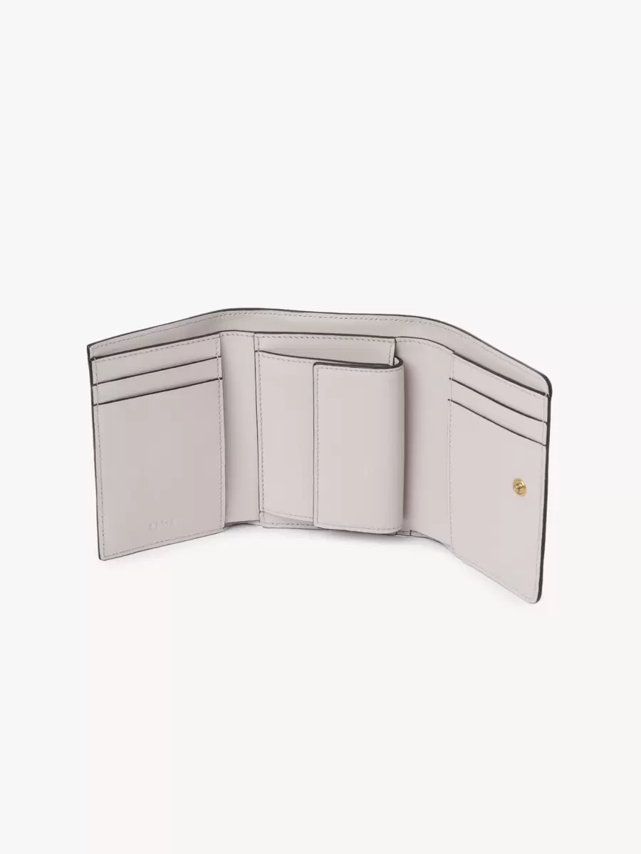 Realizzato in pelle di bufalo granata, il piccolo portafoglio tri-fold Chloé Iconic unisce un design minimalista a una firma metallica proveniente dagli archivi della Maison.