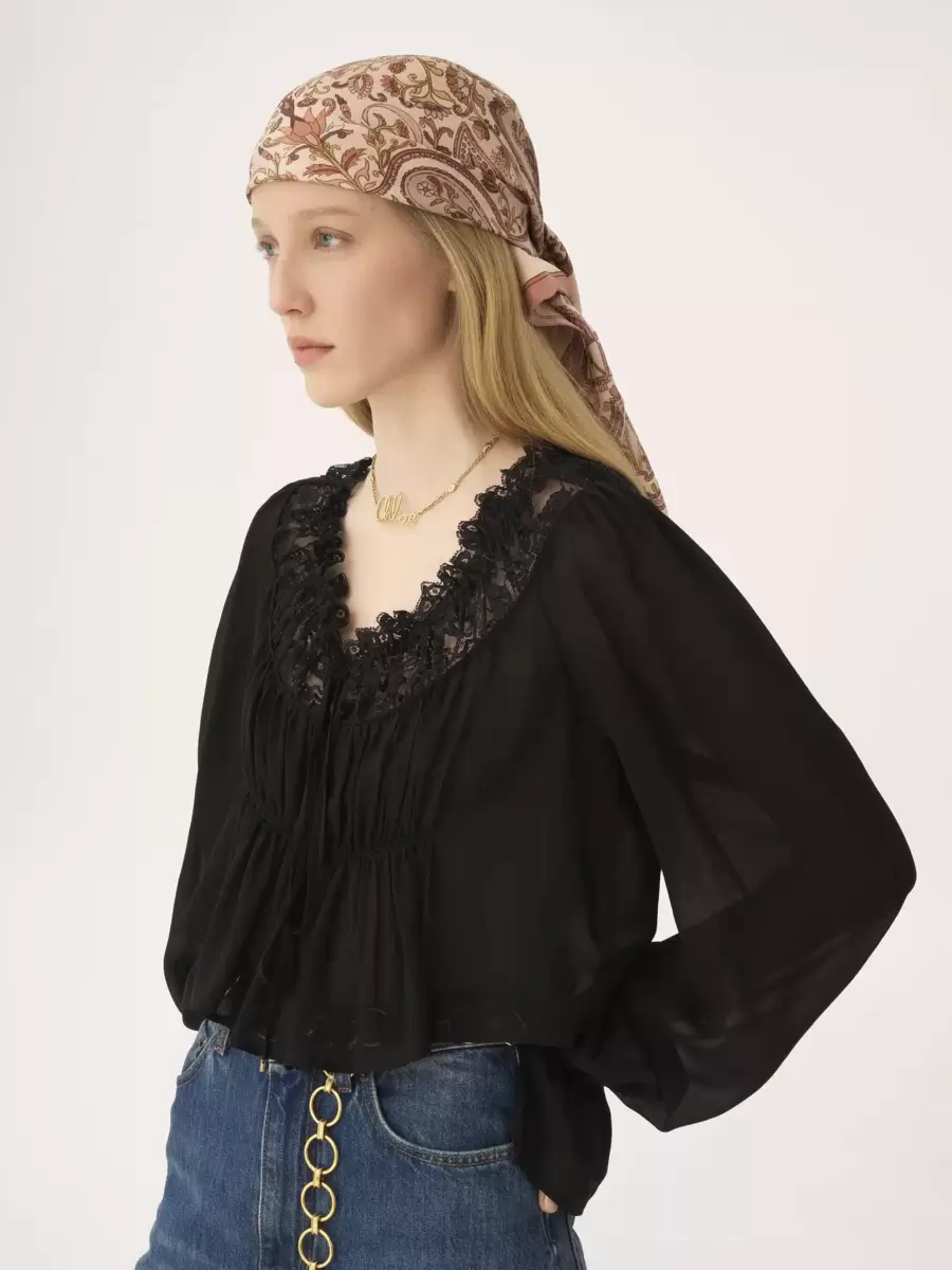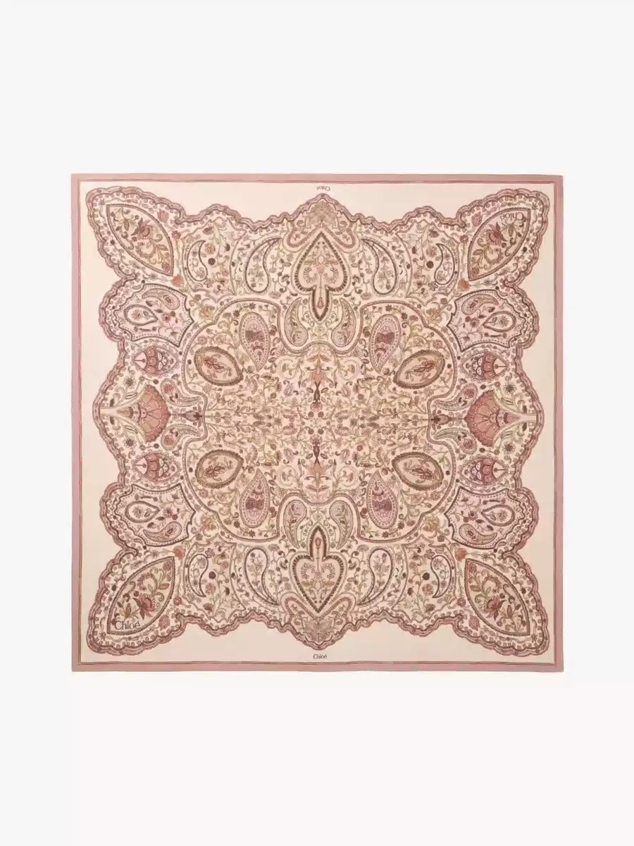 Sciarpa quadrata in twill di seta biologica con motivo paisley stampato a getto d’inchiostro. Una cornice semplice, bordi arrotolati a mano e una discreta stampa del logo Chloé completano questa sciarpa stampata.