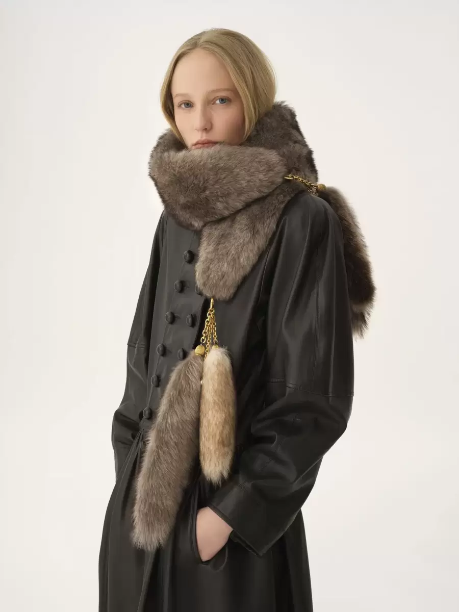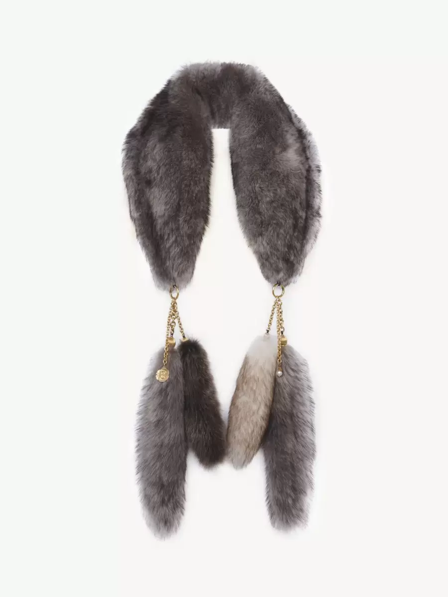 Sciarpa in shearling Treasure Tails, che unisce una sciarpa con colletto a due code piccole e due medie, montate su catene pendenti in ottone dorato per un effetto gioiello. Un ciondolo a forma di “C” floreale con incisione Chloé e una perla in resina completano questo pezzo.