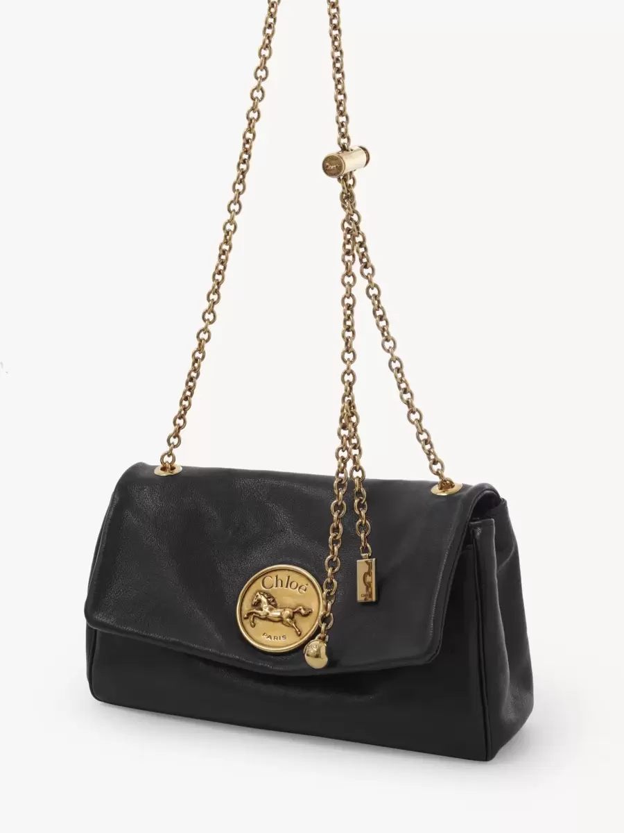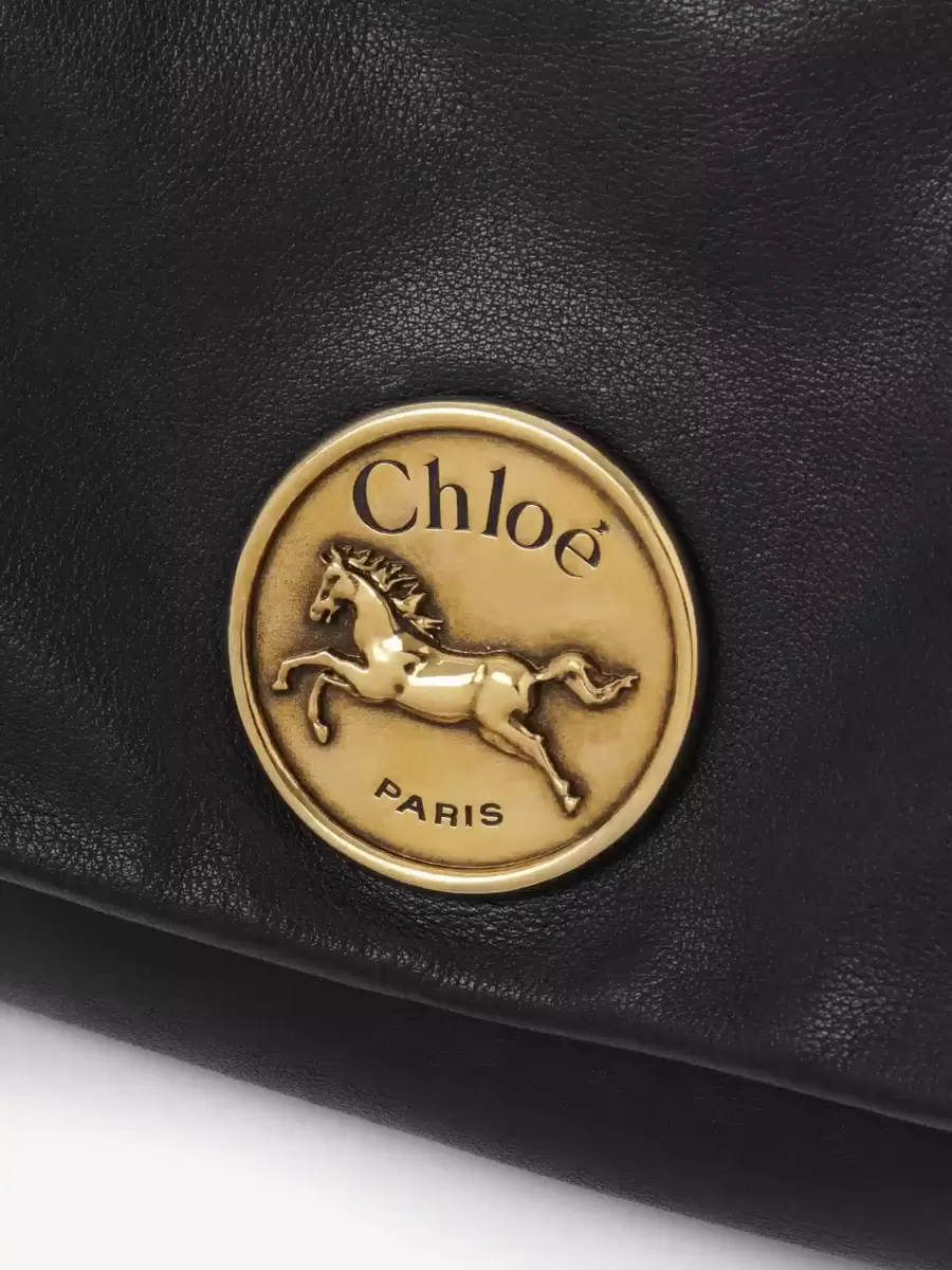 Realizzata in pelle di bufalo granata, questa borsa a spalla Chloé Heritage si ispira ai codici della Maison. La struttura morbida e curva è impreziosita da dettagli color oro, che combinano l’iconica chiusura Horse Medal con ciondoli pendenti.
