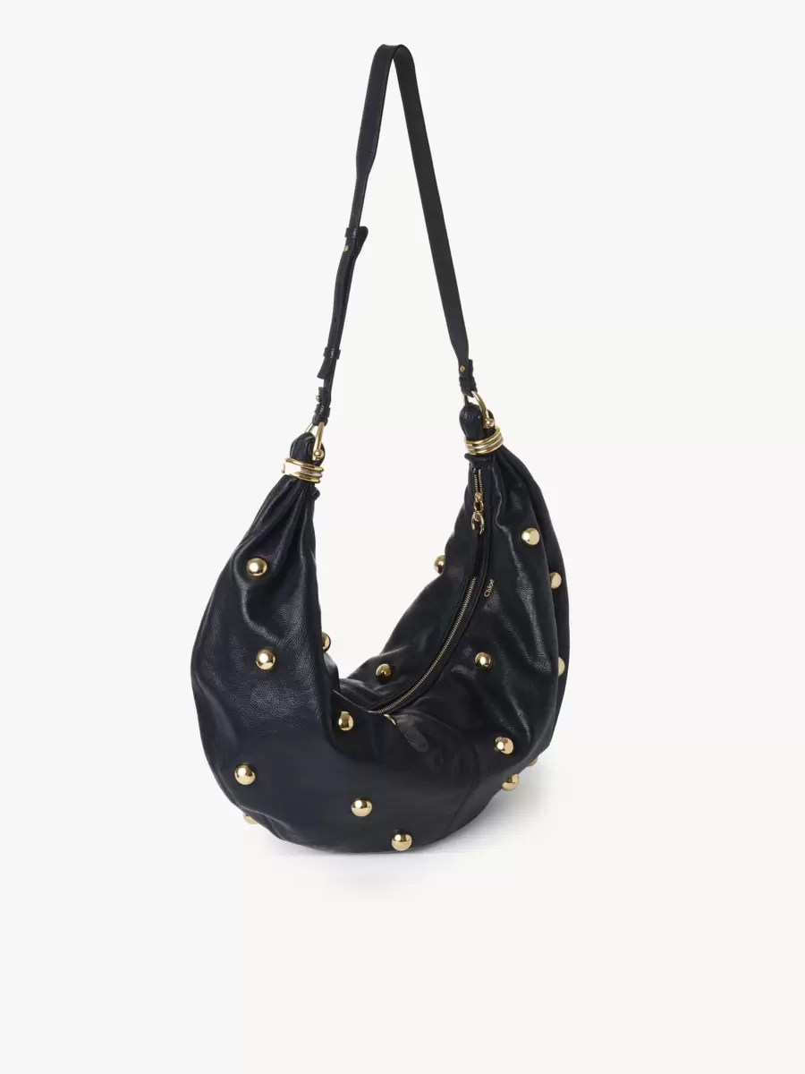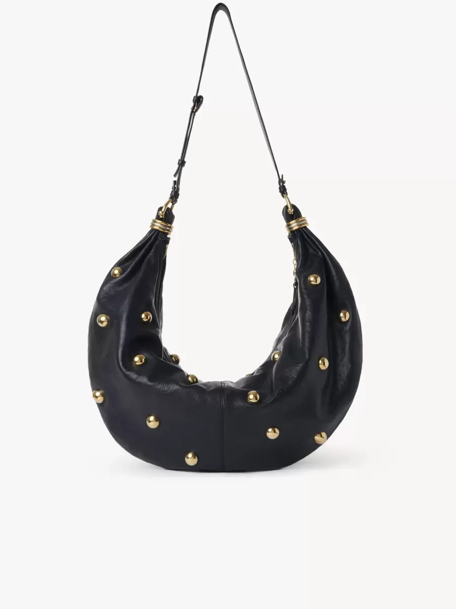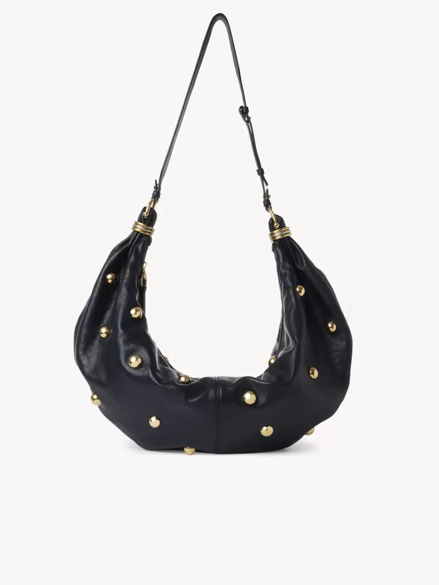 Ispirata agli archivi della Maison, questa grande borsa hobo Bracelet è realizzata in pelle di vitello martellata lucida impreziosita da borchie oversize color oro. La forma morbida e arrotondata è impreziosita da anelli bicolore sovrapposti alle estremità.