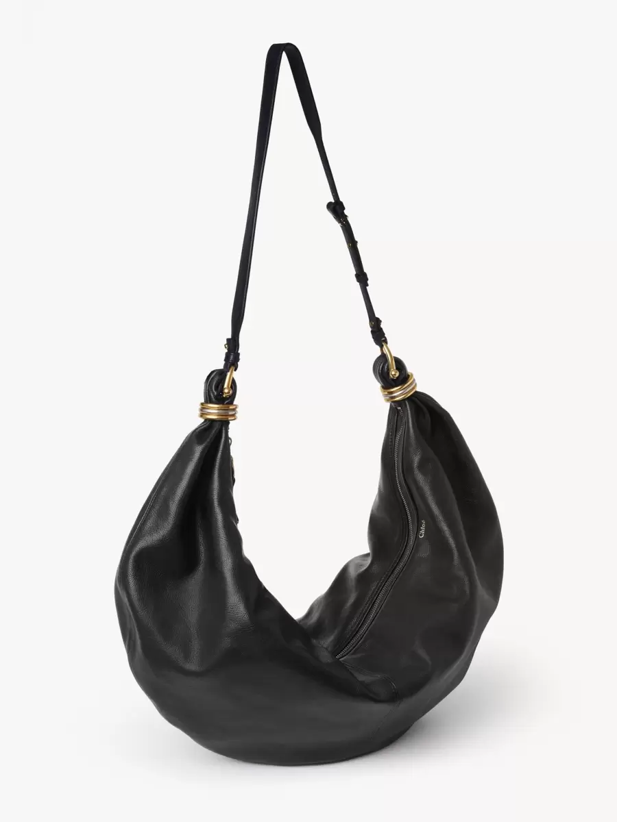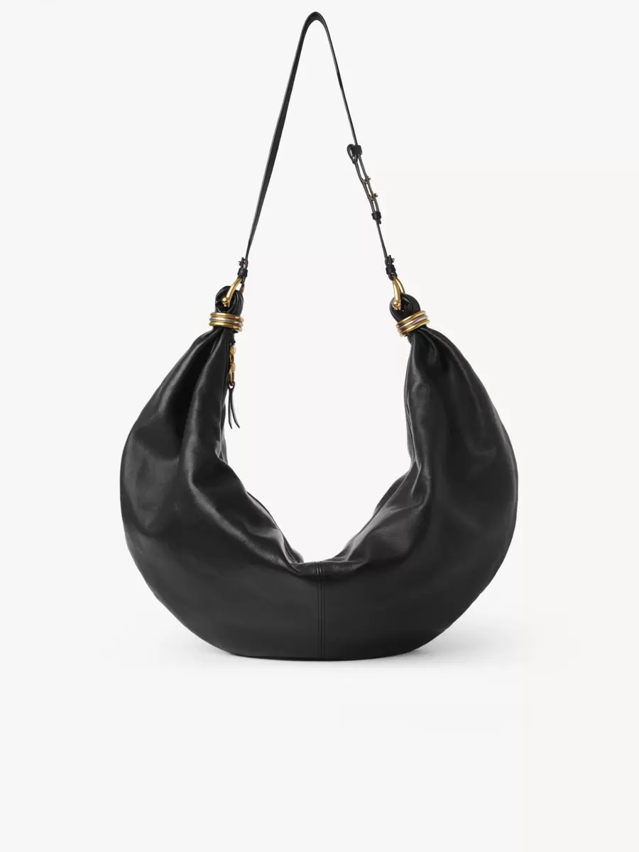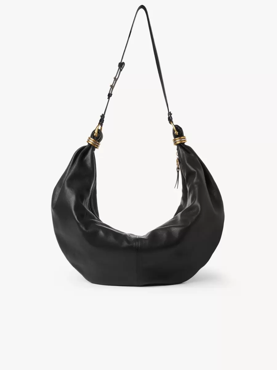 Ispirata agli archivi della Maison, questa borsa Bracelet Hobo oversize è realizzata in pelle di vitello granata lucida. La forma morbida e arrotondata è impreziosita da anelli bicolore sovrapposti alle estremità.