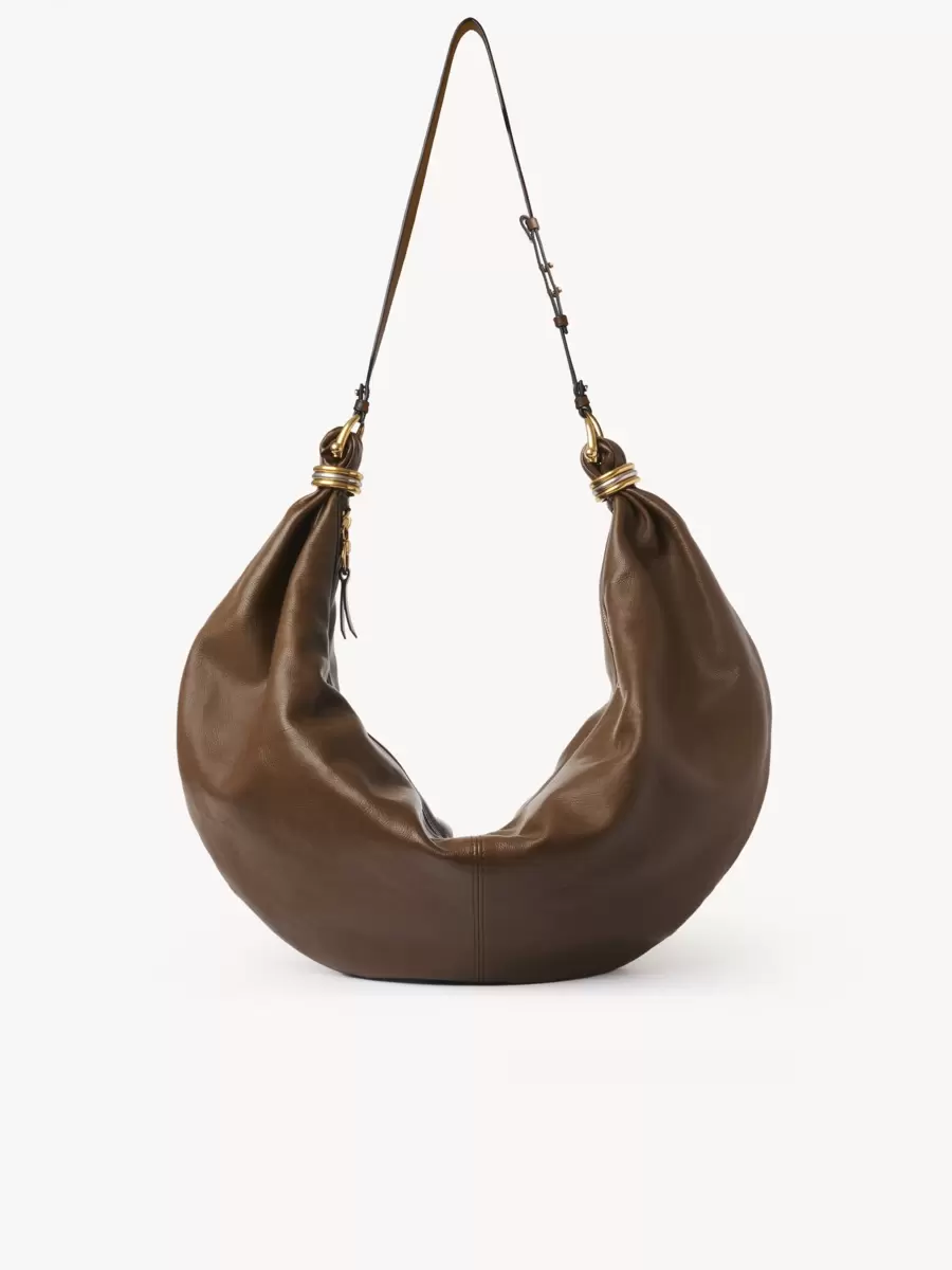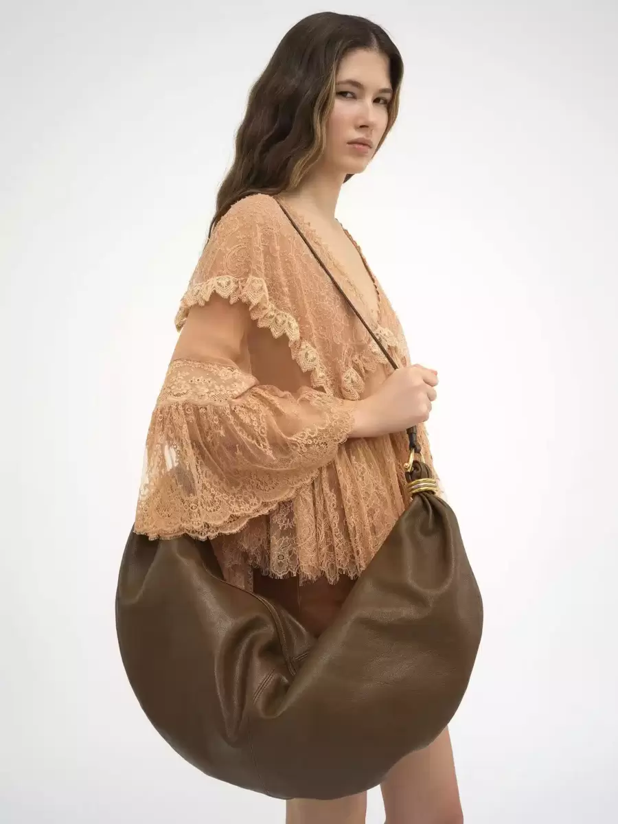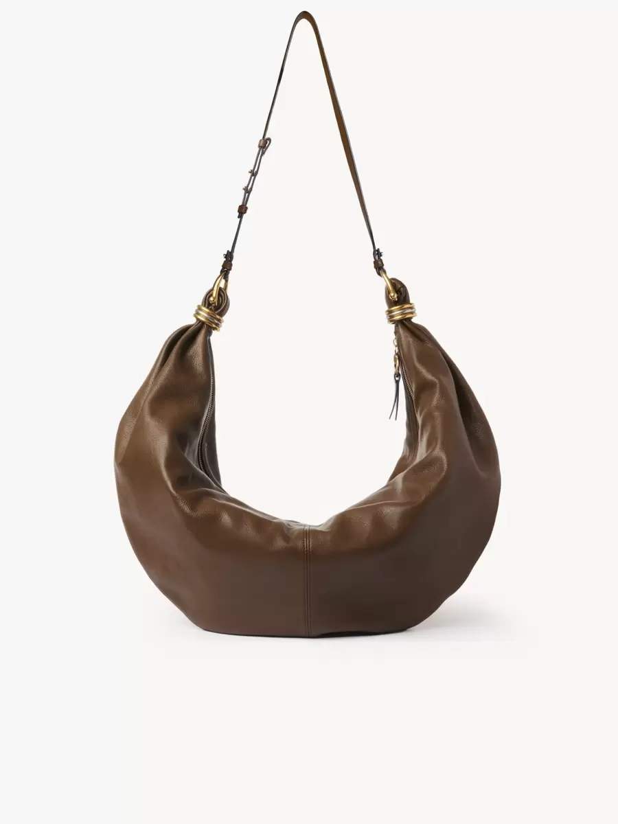 Ispirata agli archivi della Maison, questa borsa Bracelet Hobo oversize è realizzata in pelle di vitello granata lucida. La forma morbida e arrotondata è impreziosita da anelli bicolore sovrapposti alle estremità.