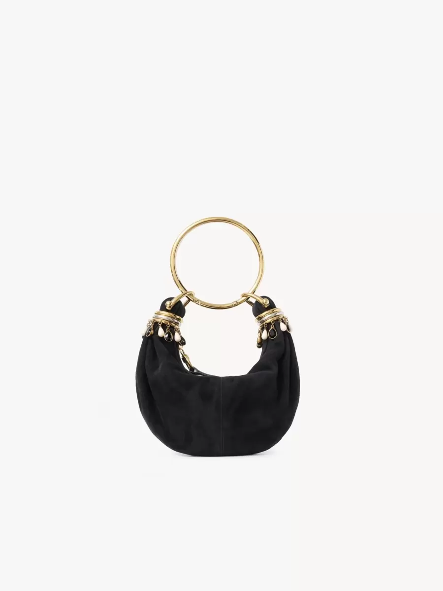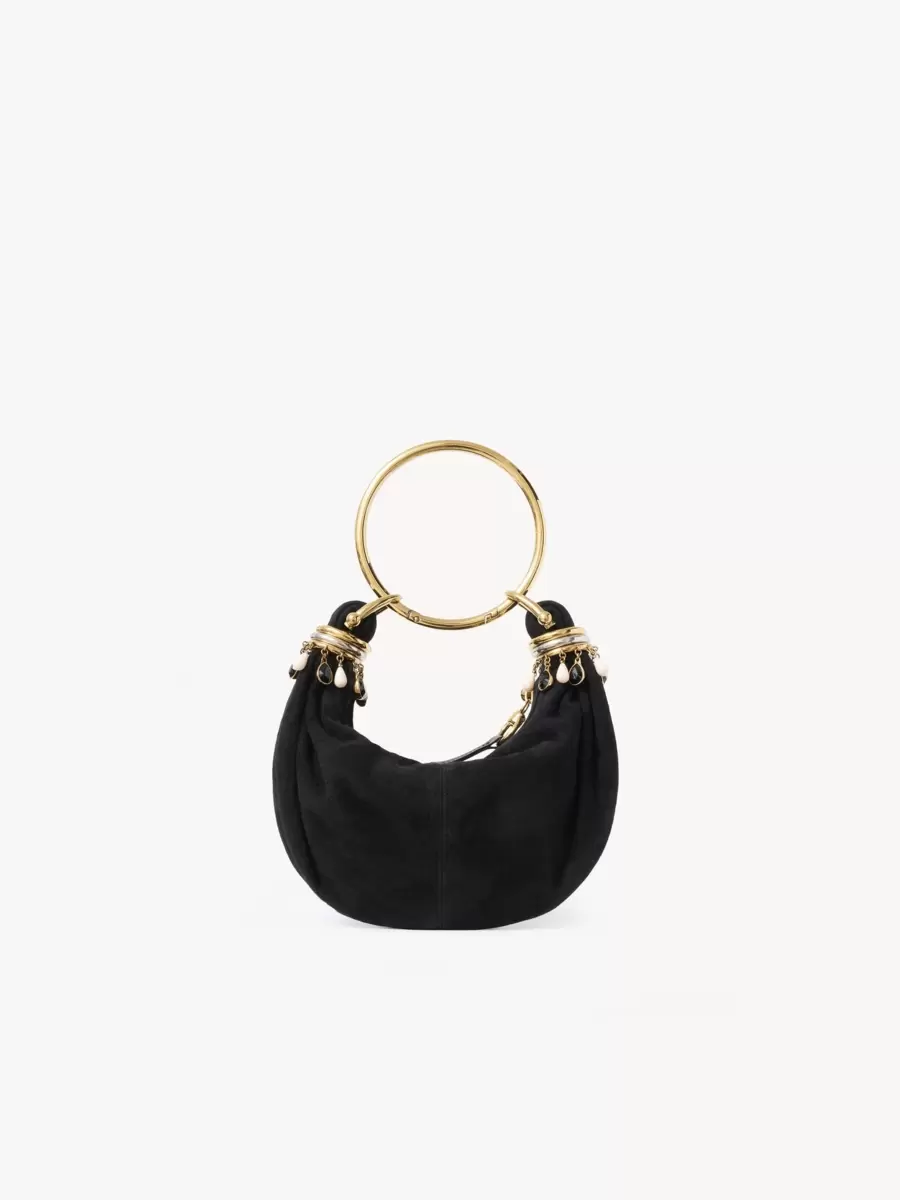 Ispirata agli archivi della Maison, questa mini borsa Bracelet Hobo è realizzata in pelle di capra scamosciata con una forma morbida e arrotondata, impreziosita da un manico a bracciale. Anelli bicolore sovrapposti e perline pendenti aggiungono un tocco di gioielleria.