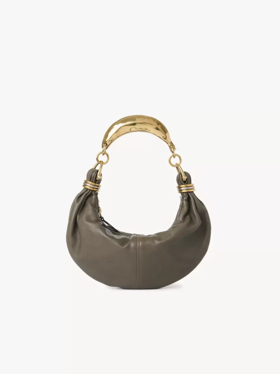 Questa piccola borsa hobo Bracelet è realizzata in pelle di bufalo martellata lucida. La forma morbida e arrotondata è impreziosita da un giocoso manico a banana ispirato alla collezione Primavera 2001 della Maison. Anelli bicolore sovrapposti completano le estremità.