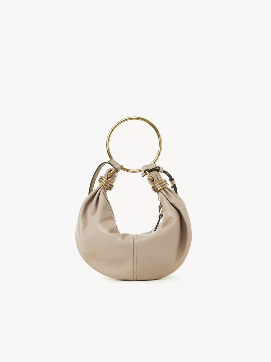 Ispirata alla tradizione della Maison, questa piccola borsa Bracelet Hobo è realizzata in pelle di vitello martellata lucida. La forma morbida e arrotondata è impreziosita da un manico a bracciale e da anelli bicolore sovrapposti alle estremità.