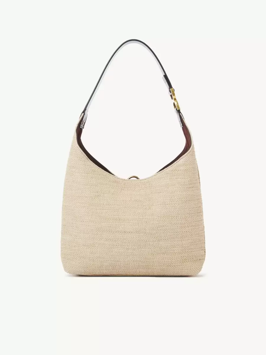 Questa piccola borsa hobo Marcie ha una silhouette morbida e minimalista. Realizzata in fibre effetto rafia, presenta un manico in pelle borchiata impreziosito dall’iconico dettaglio metallico dorato della linea. Le nappe in pelle distintive completano questa piccola borsa.