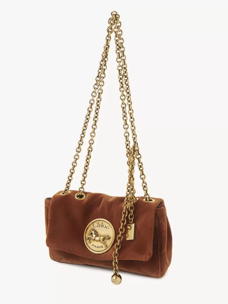 Realizzata in velluto trapuntato, questa piccola borsa a spalla Chloé Heritage si ispira ai codici della Maison. La struttura morbida e curva è impreziosita da dettagli color oro, che combinano l’iconica chiusura Horse Medal con ciondoli pendenti.