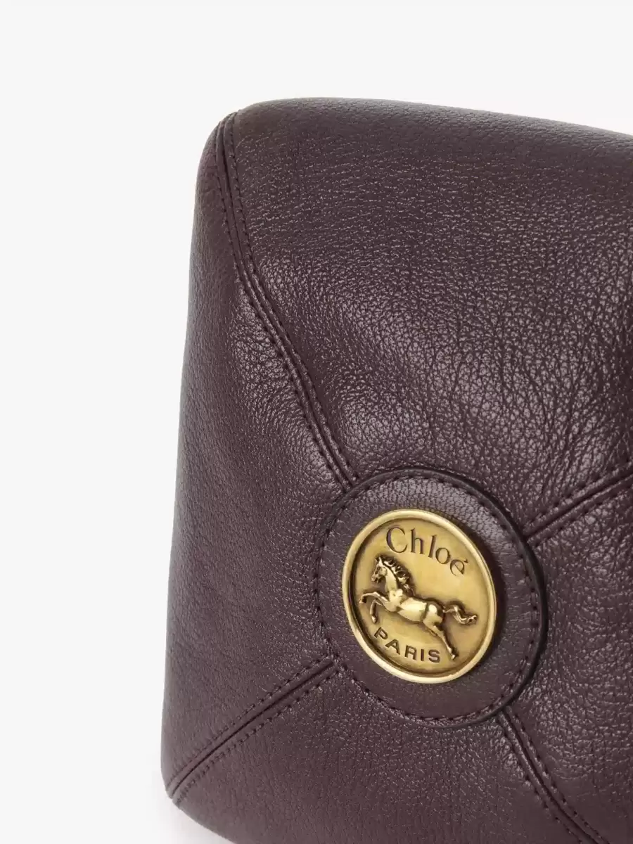 Questa piccola borsa Chloé Balloon è realizzata in un patchwork di pelle di bufalo granata e pelle di vacchetta granata lucida. La silhouette arrotondata e destrutturata è rifinita con una chiusura a barilotto color oro di ispirazione equestre e una catena, mentre la medaglia a forma di cavallo, simbolo della Maison, impreziosisce la base della borsa.