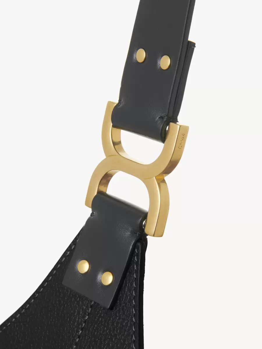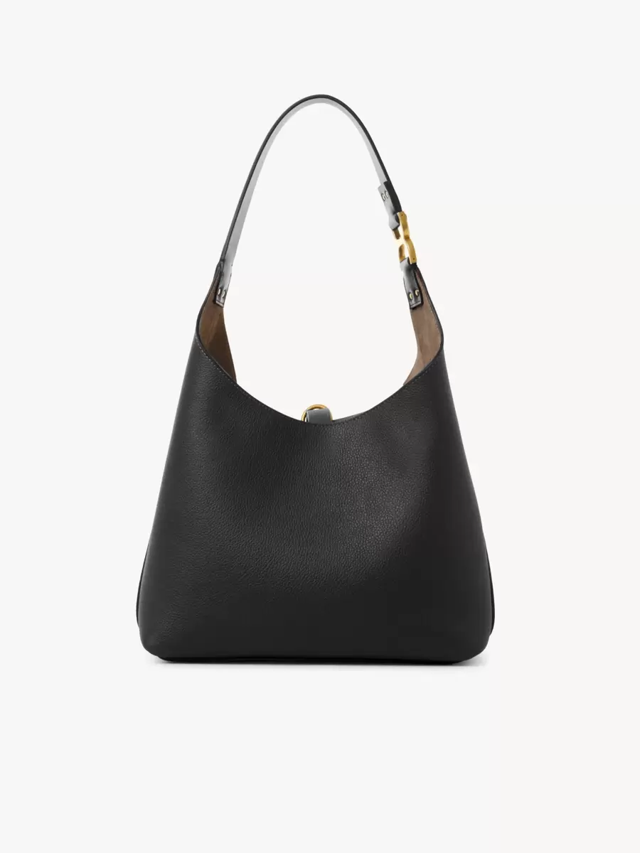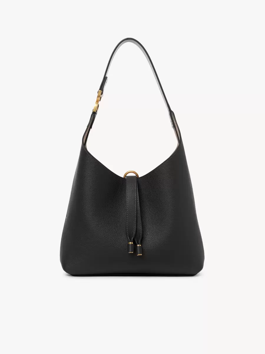 Questa piccola borsa hobo Marcie ha una silhouette morbida e minimalista. Realizzata in pelle di vitello granata, presenta un manico borchiato a contrasto impreziosito dall’iconico dettaglio metallico dorato della linea. Le nappe in pelle distintive proteggono l’interno in pelle di vitello scamosciata.