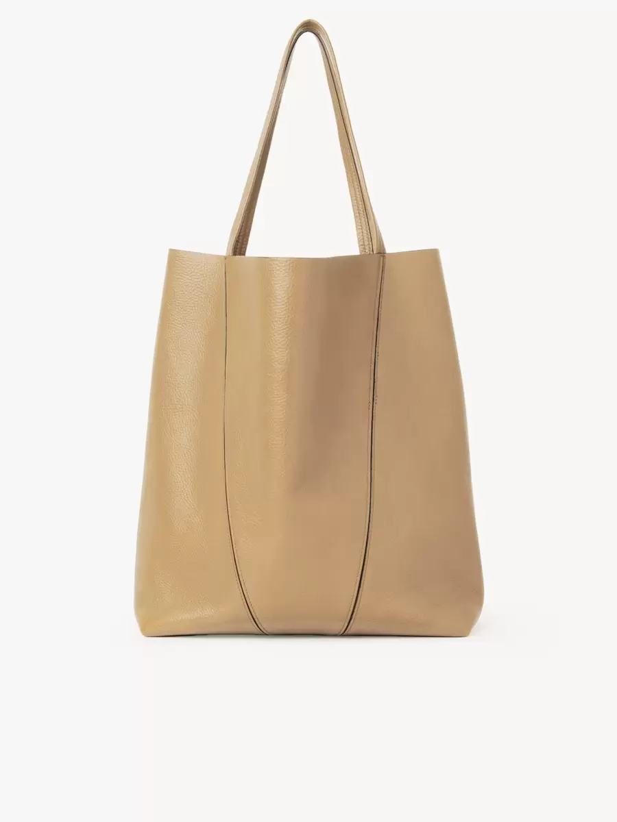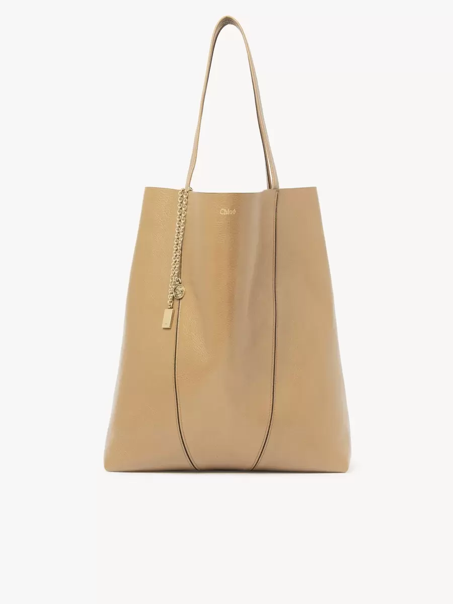 Realizzata in pelle di vacchetta granata lucida, la grande borsa tote Chloé Spin ha una silhouette minimalista impreziosita da linee grafiche. Una catena pendente presenta le medaglie Chloé e Horse, simbolo della Maison.