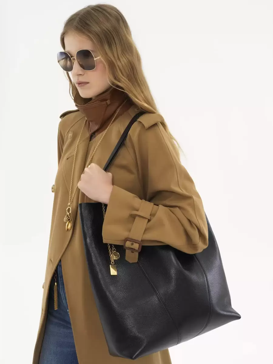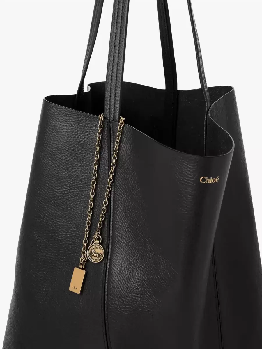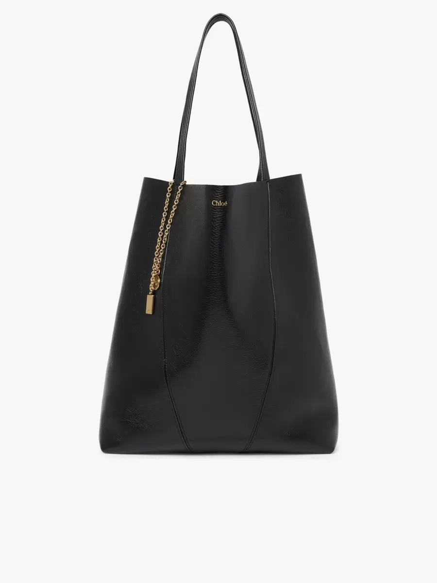 Realizzata in pelle di vacchetta granata lucida, la grande borsa tote Chloé Spin ha una silhouette minimalista impreziosita da linee grafiche. Una catena pendente presenta le medaglie Chloé e Horse, simbolo della Maison.