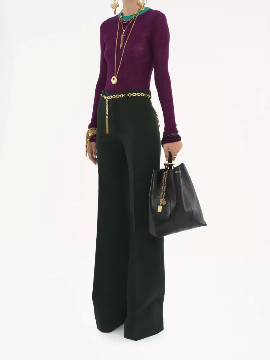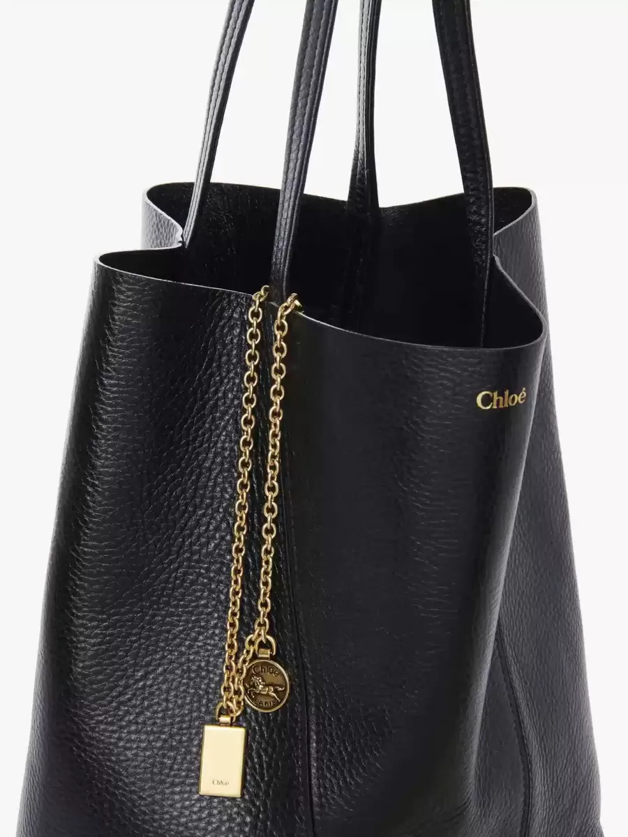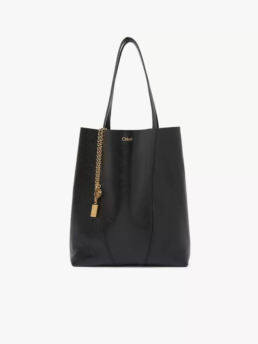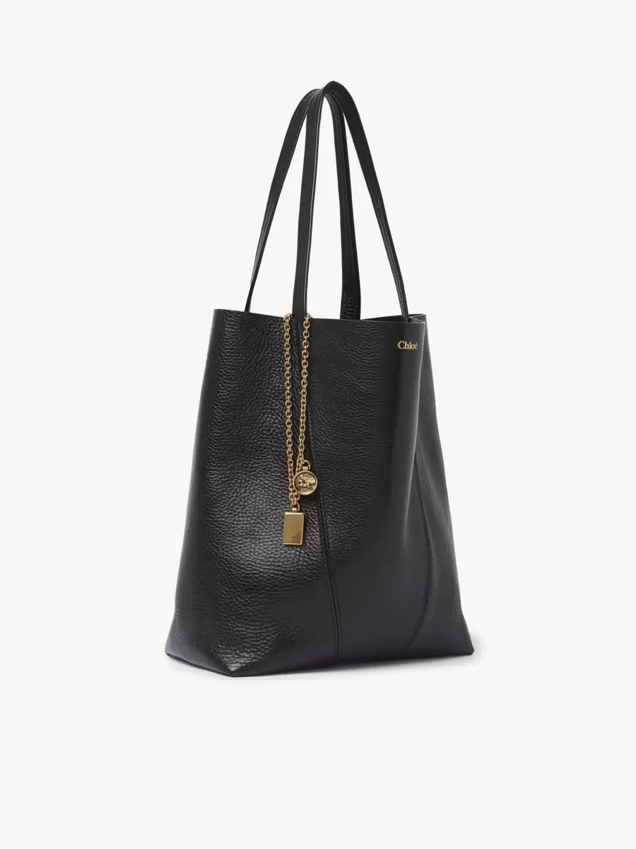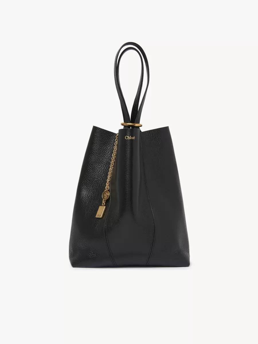 Realizzata in pelle di vacchetta granata lucida, la borsa tote Chloé Spin ha una silhouette minimalista impreziosita da linee grafiche. Una catena pendente presenta le medaglie Chloé e Horse, simbolo della Maison.