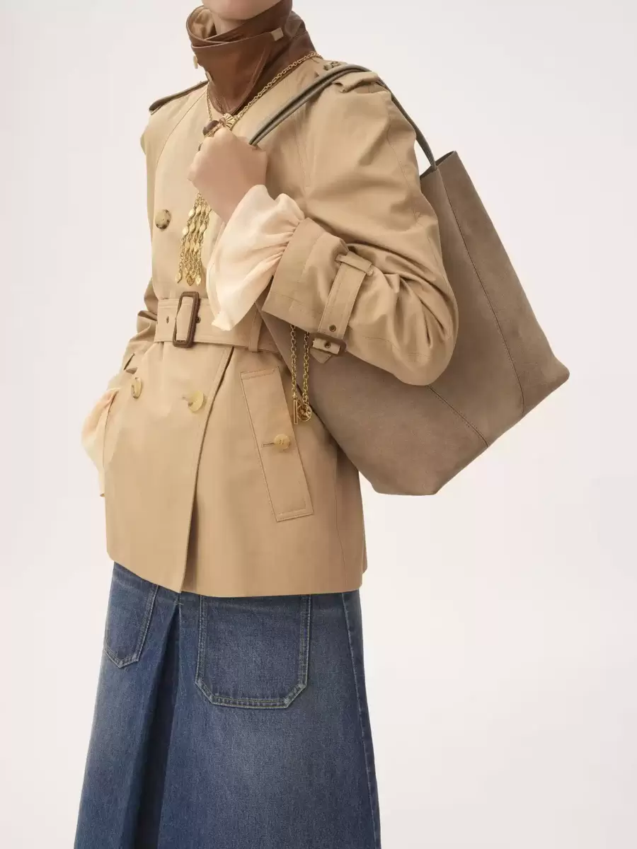 Realizzata in pelle di vitello scamosciata, la borsa tote Chloé Spin ha una silhouette minimalista impreziosita da linee grafiche. Una catena pendente presenta le medaglie Chloé e Horse, simbolo della Maison.
