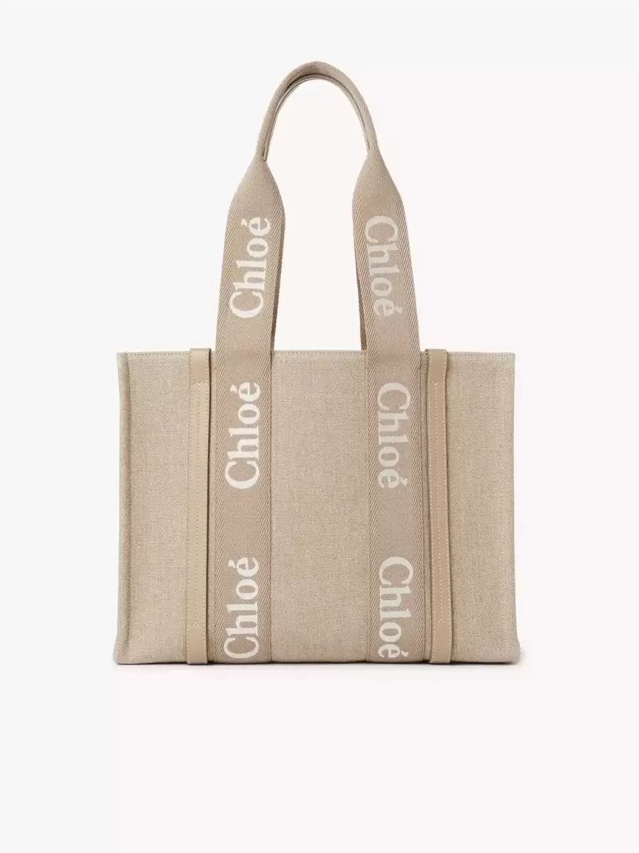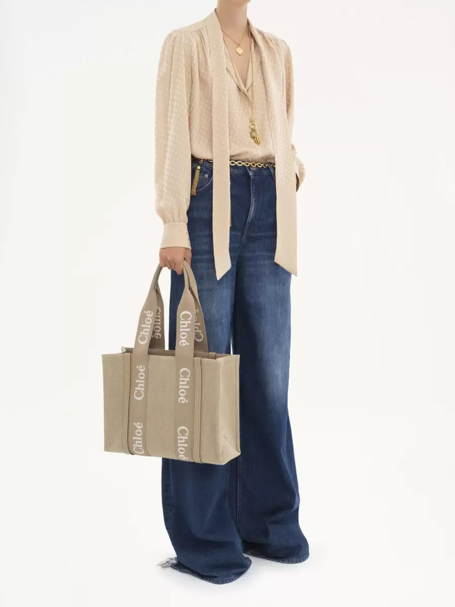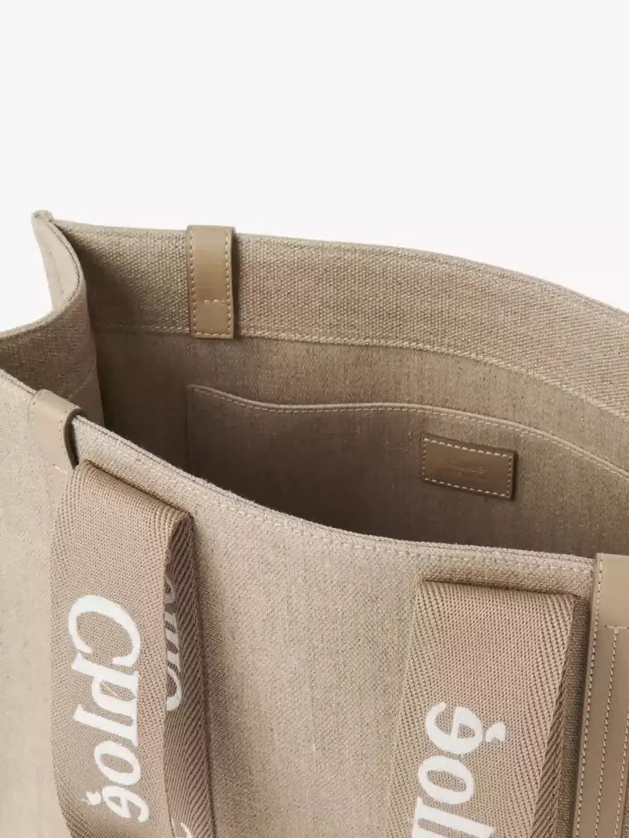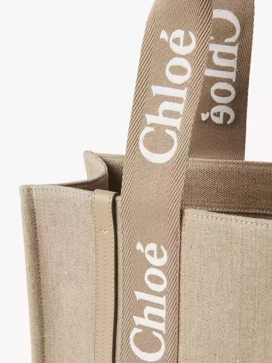 Borsa tote in tela di lino, pelle di vitello e fettuccia con ricamo del logo Chloé