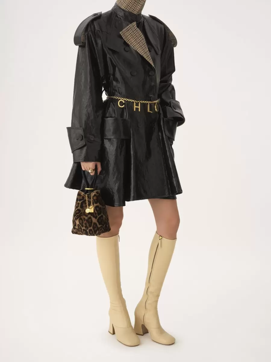 Realizzata in shearling con stampa leopardata, la piccola borsa tote Chloé Spin ha una silhouette minimalista impreziosita da linee grafiche. Una catena pendente presenta le medaglie Chloé e Horse, simbolo distintivo della Maison.