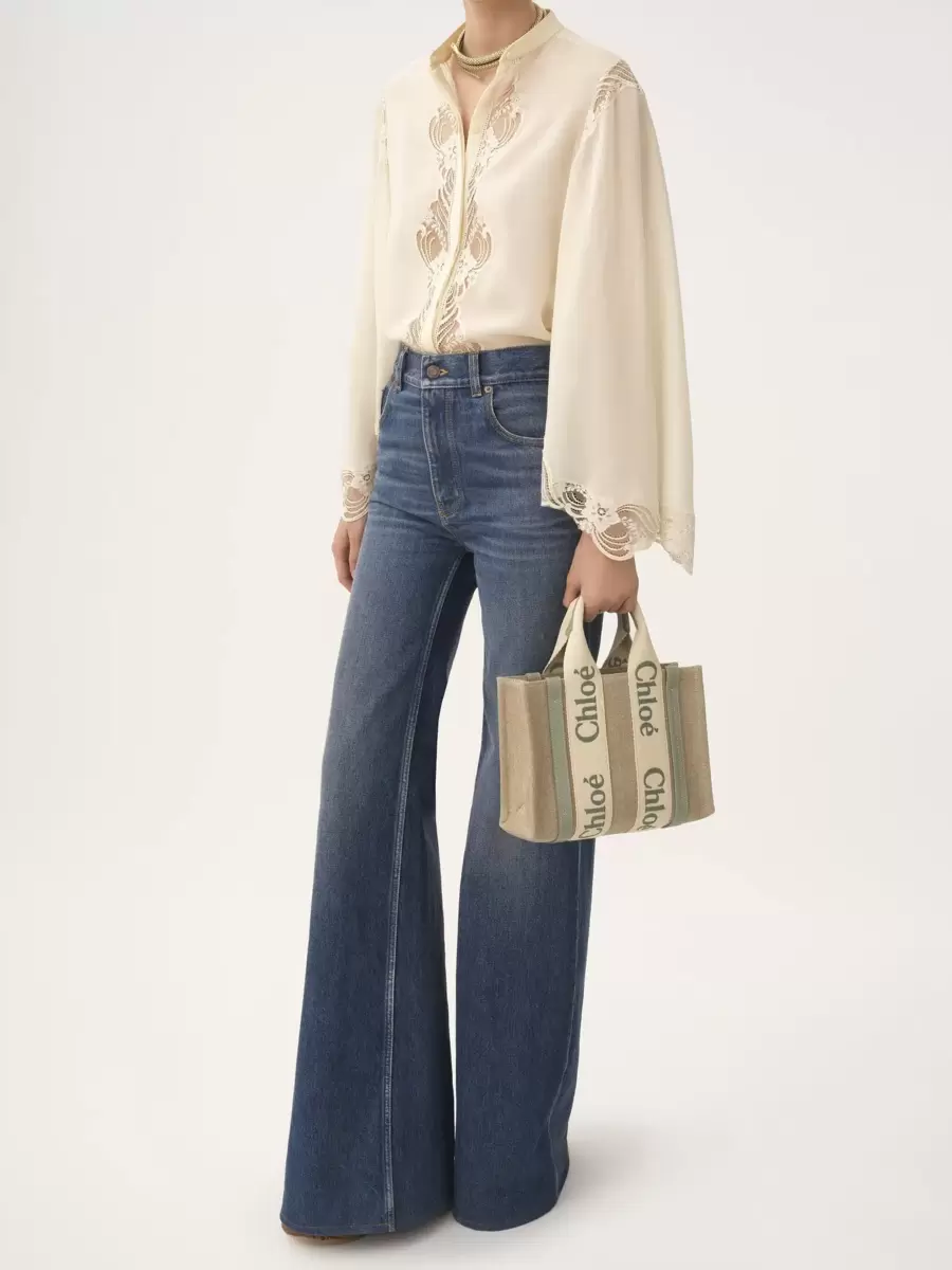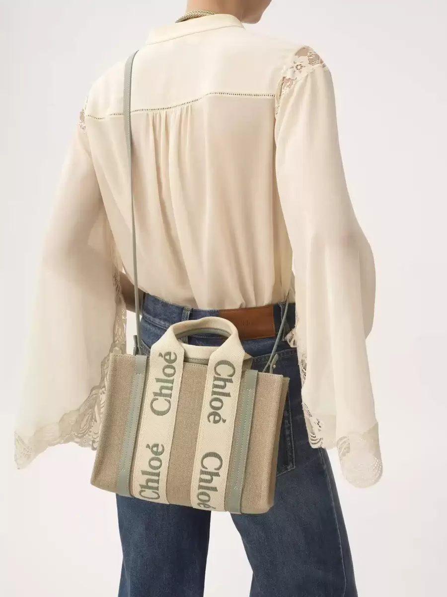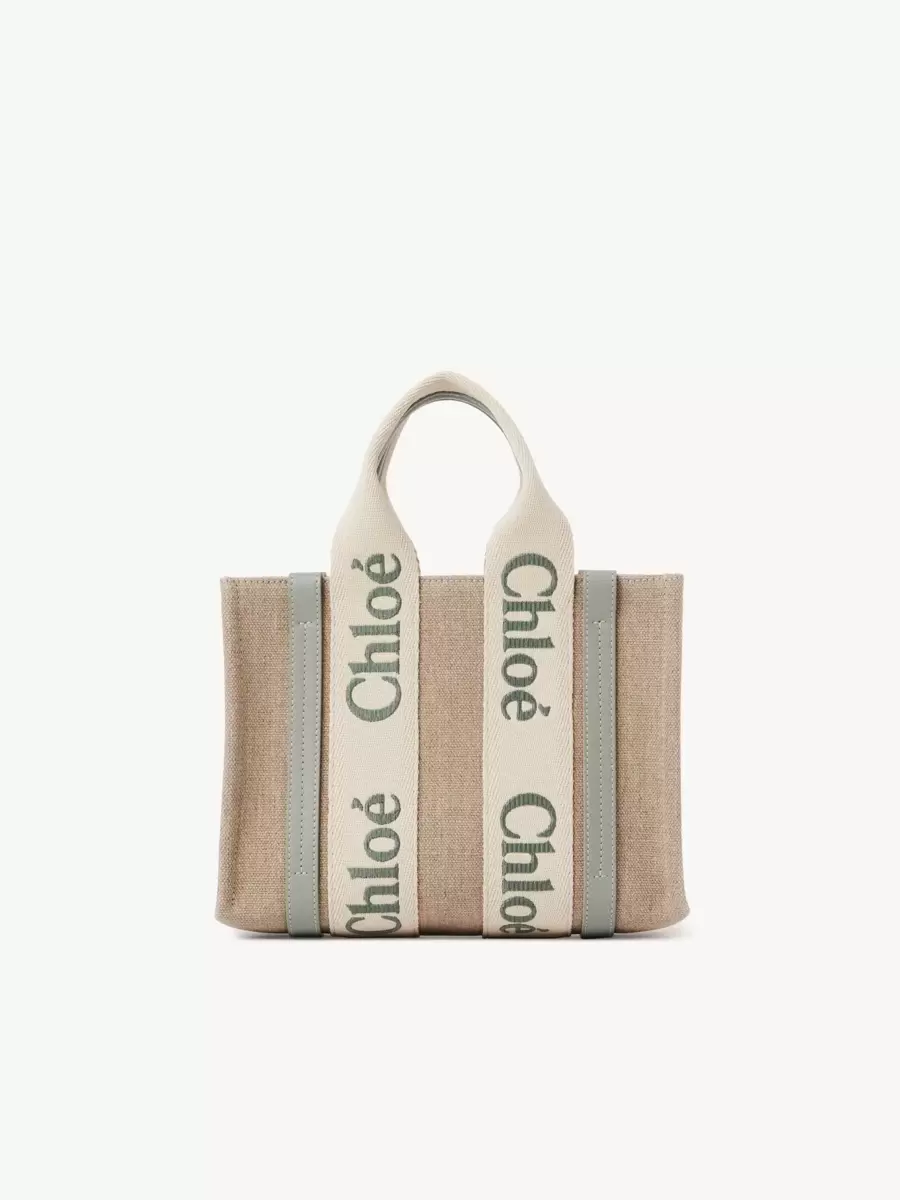 Borsa tote Woody piccola in tela di lino, pelle di vitello e fettuccia con ricamo del logo Chloé