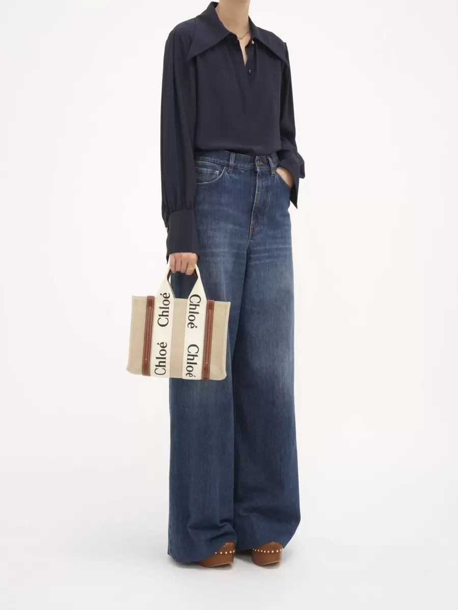 Borsa tote in tela di lino e pelle di vitello lucida con logo Chloé in lino