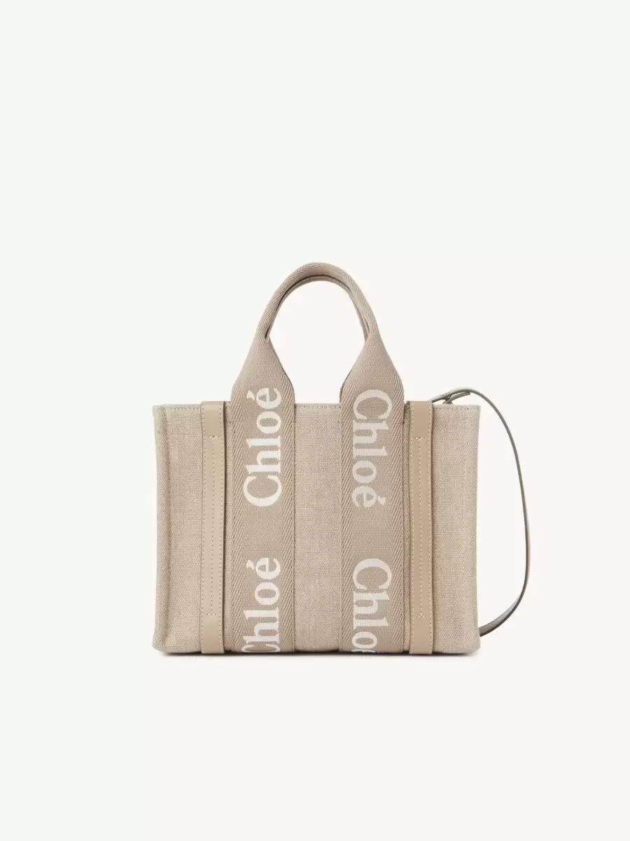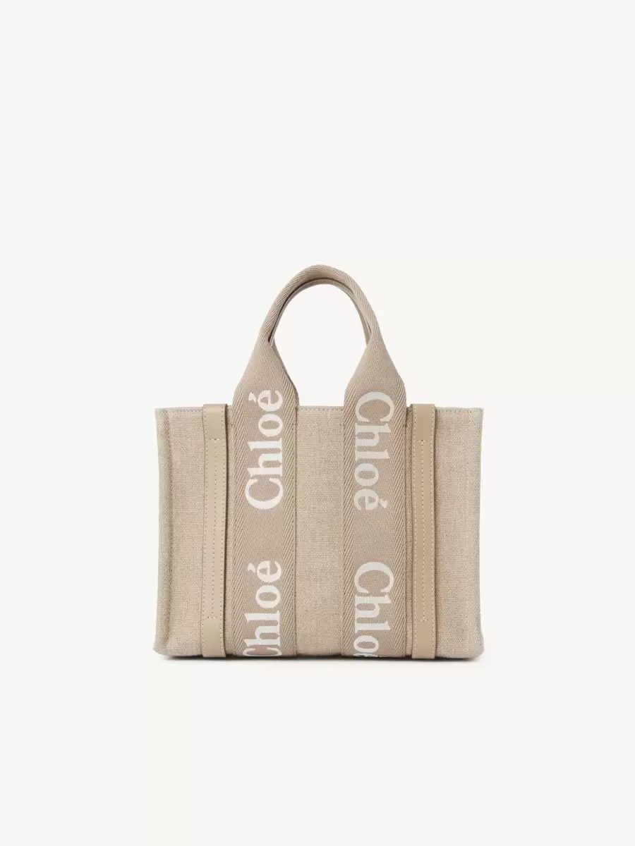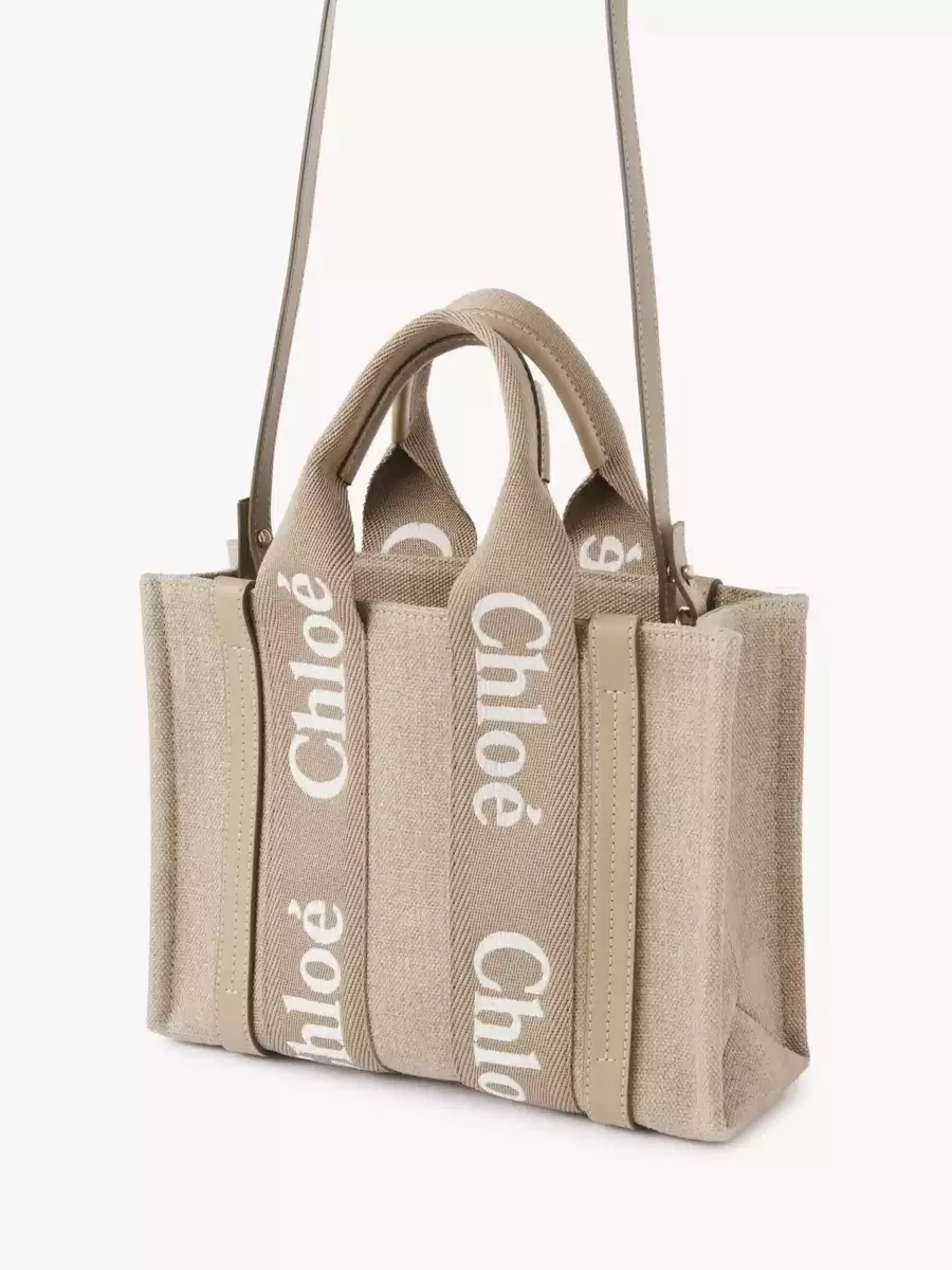 Questa piccola borsa tote Woody è realizzata in tela di lino, impreziosita da strisce verticali a contrasto in pelle di vitello lucida e nastri in tela distintivi ricamati con il logo Chloé.