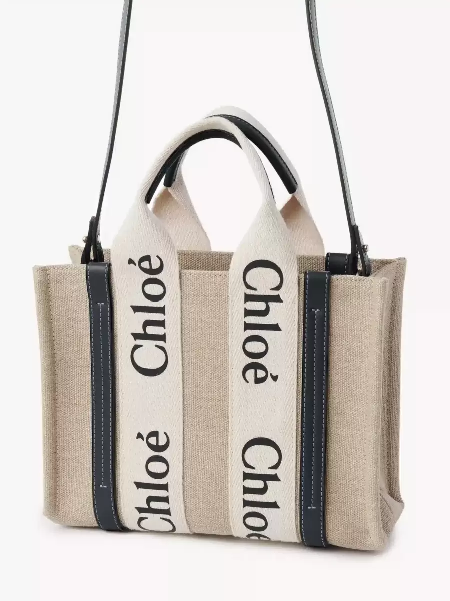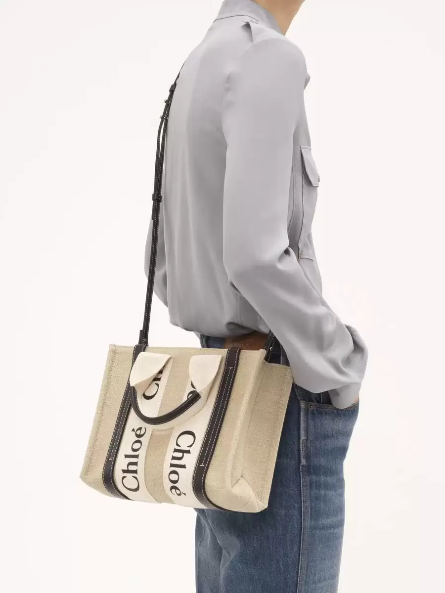 La linea Woody è caratterizzata dal logo Chloé, ripreso dalle iconiche mules della Maison. Presenta una silhouette moderna e minimalista che spazia dalle dimensioni nano a quelle grandi.