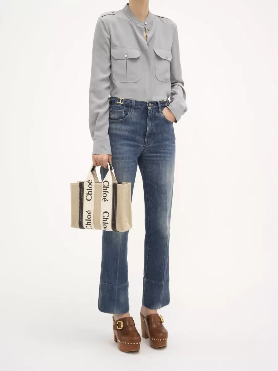 Borsa tote in tela di lino e pelle di vitello lucida con logo Chloé in lino