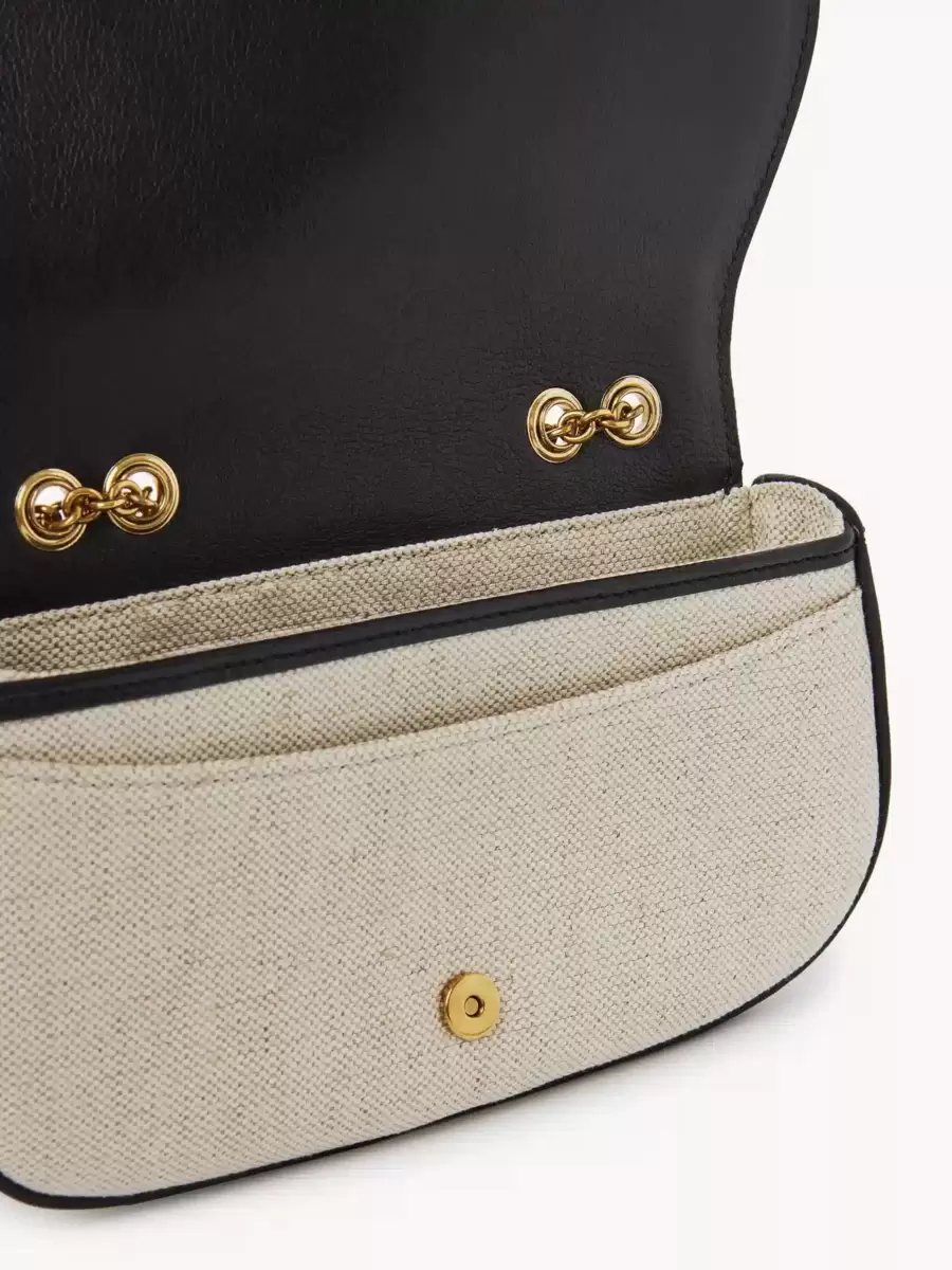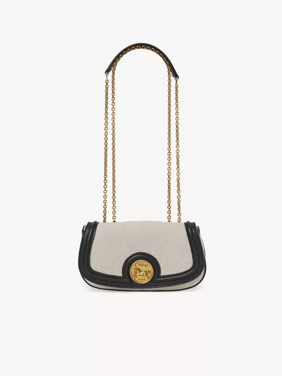 Questa borsa a tracolla Horse Medal è realizzata in un mix di tela di cotone e pelle di bufalo granata. La silhouette arrotondata abbina linee grafiche all’iconica medaglia dorata della Maison, con l’immagine in rilievo di un cavallo al galoppo e l’incisione del logo Chloé Paris.