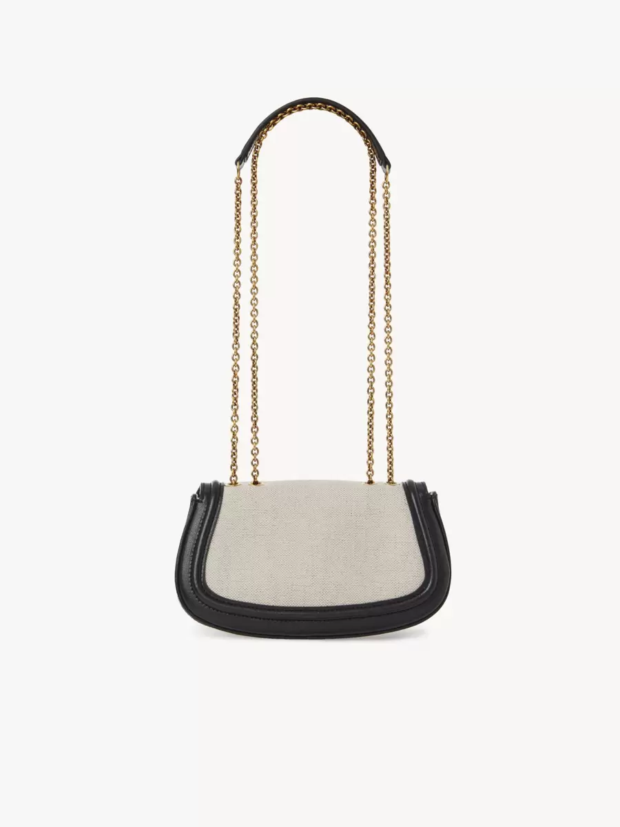 Questa mini borsa è dotata di una tracolla a catena per il trasporto a tracolla.