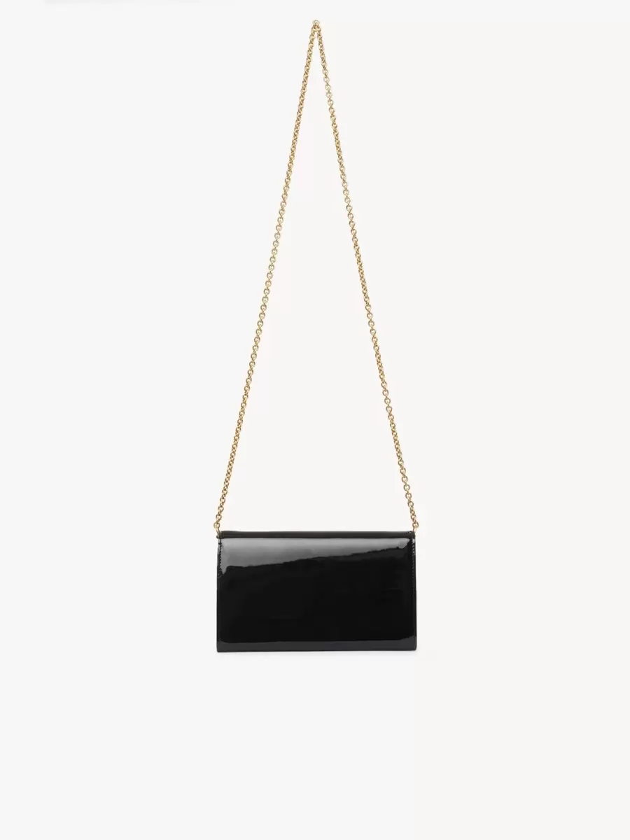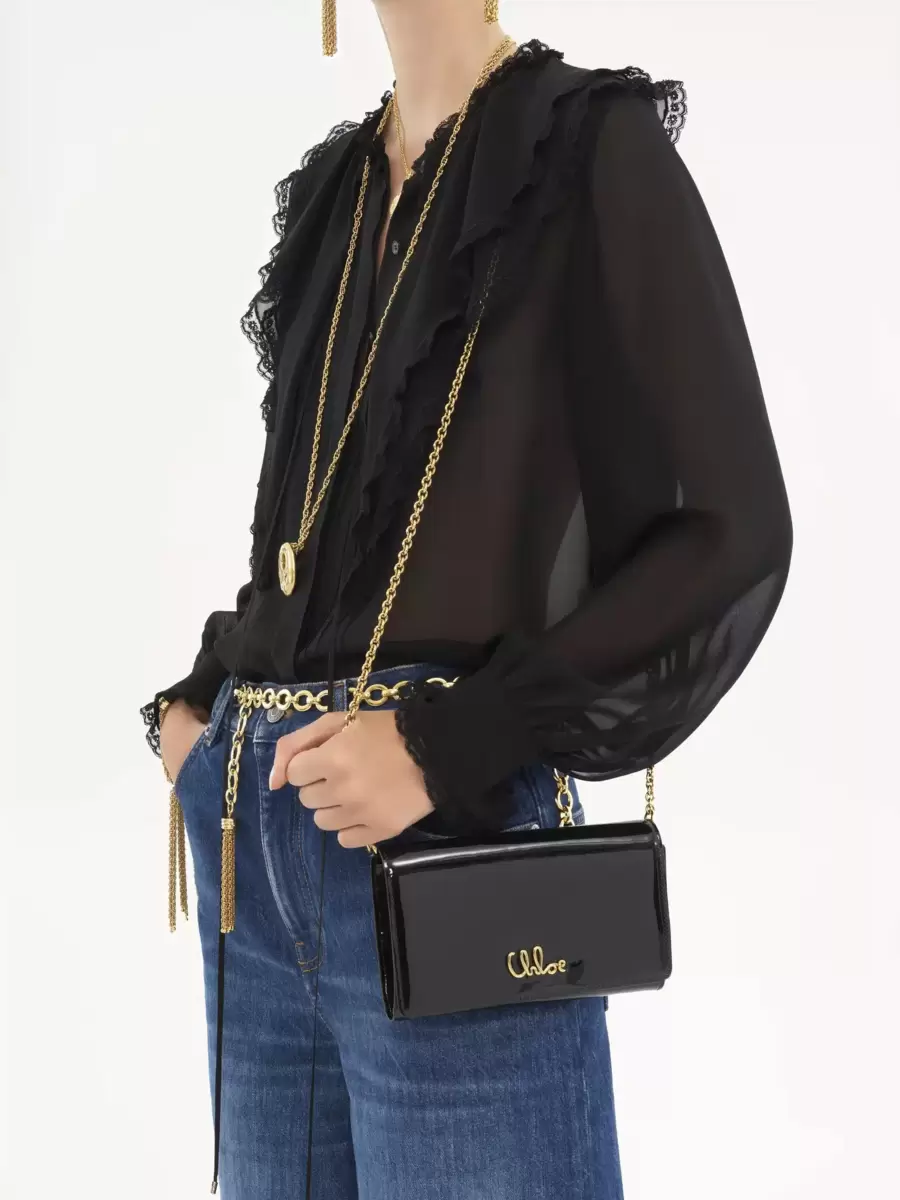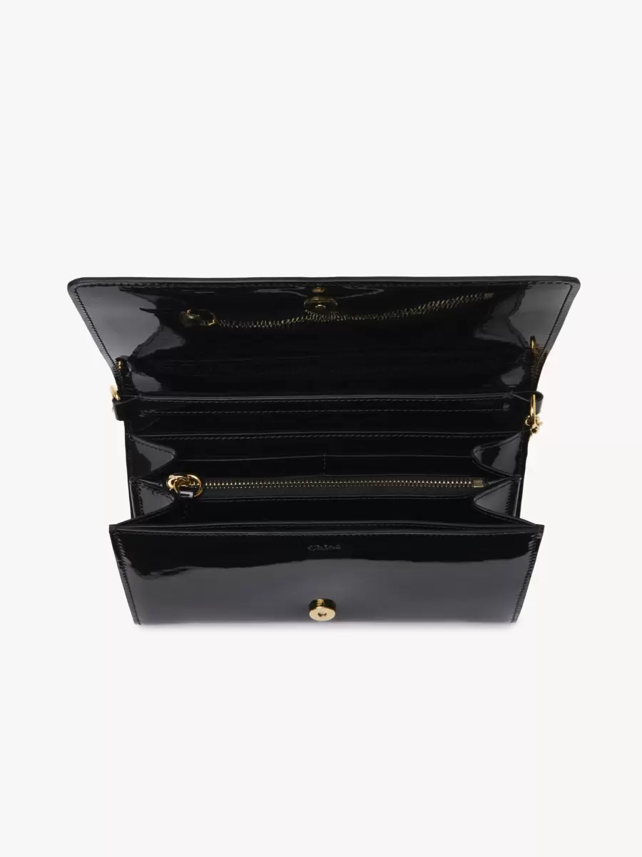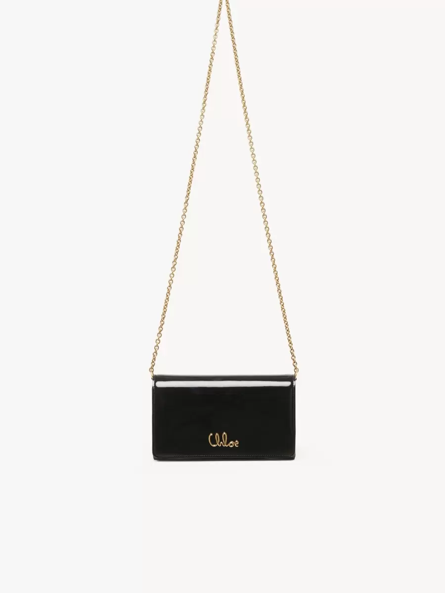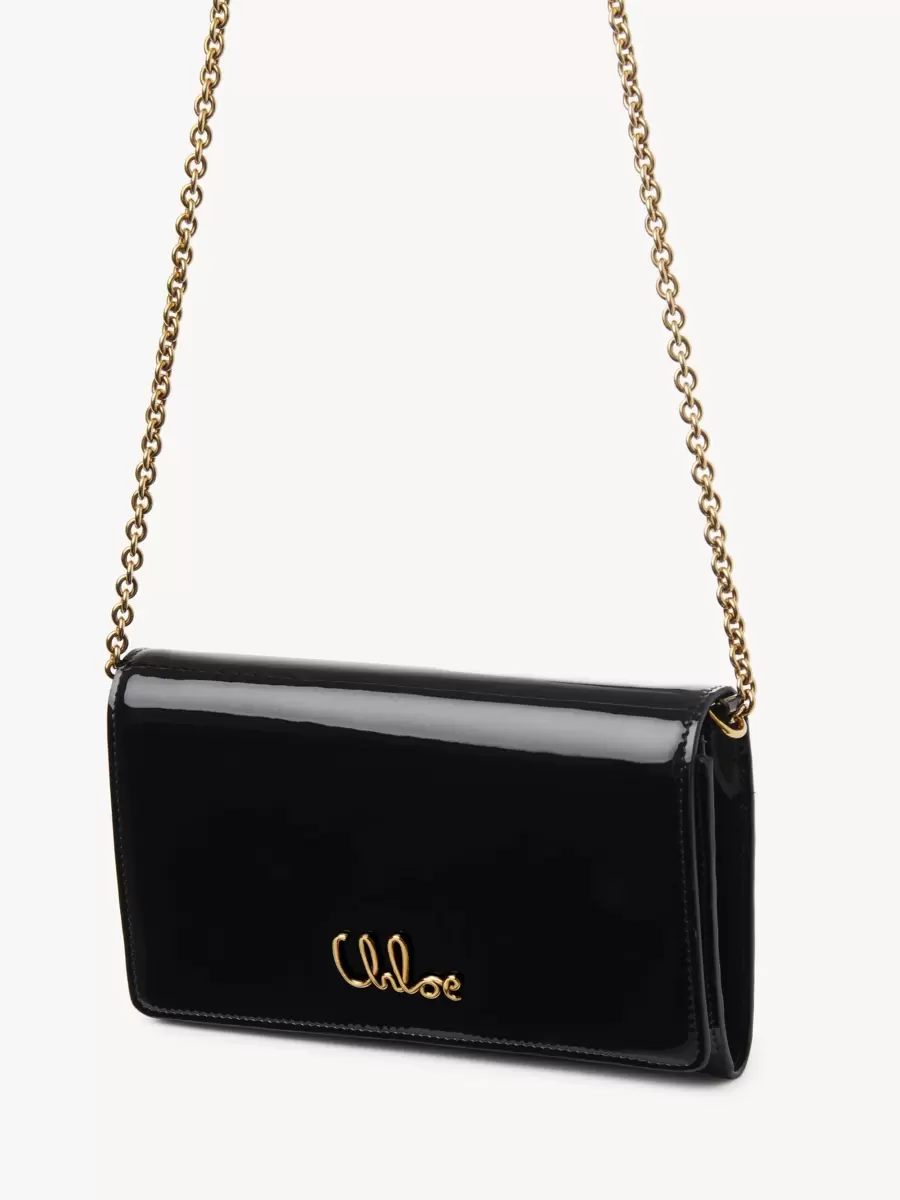 Realizzato in pelle di vitello verniciata, il portafoglio con patta e catena Chloé Iconic unisce una silhouette minimalista a una firma metallica proveniente dagli archivi della Maison.