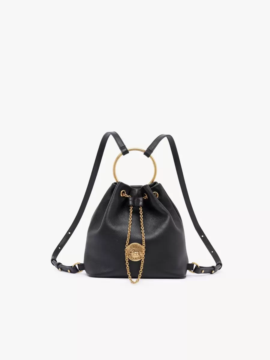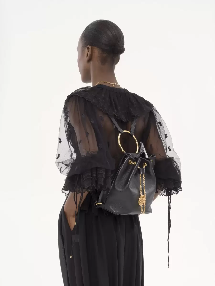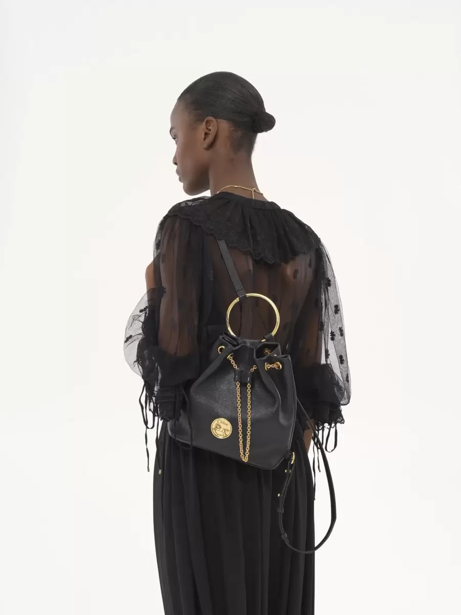 Il piccolo zaino Bracelet è realizzato in pelle di bufalo granata. La silhouette morbida è impreziosita da un manico oversize a forma di braccialetto, una catena con coulisse e la medaglia a forma di cavallo, simbolo della Maison.