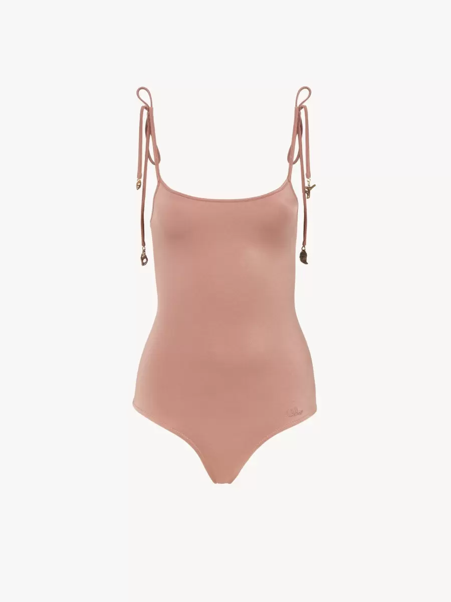 Costume intero in jersey elasticizzato lucido. Spalline sottili annodate sulle spalle e impreziosite da ciondoli dorati.