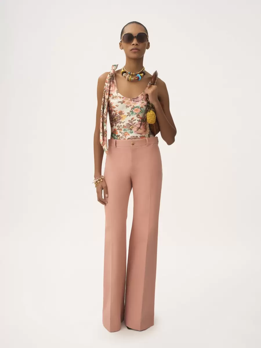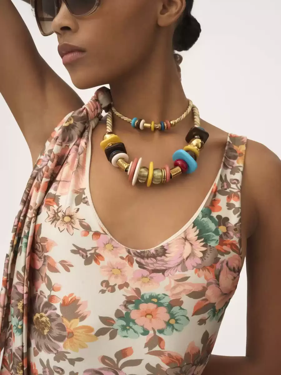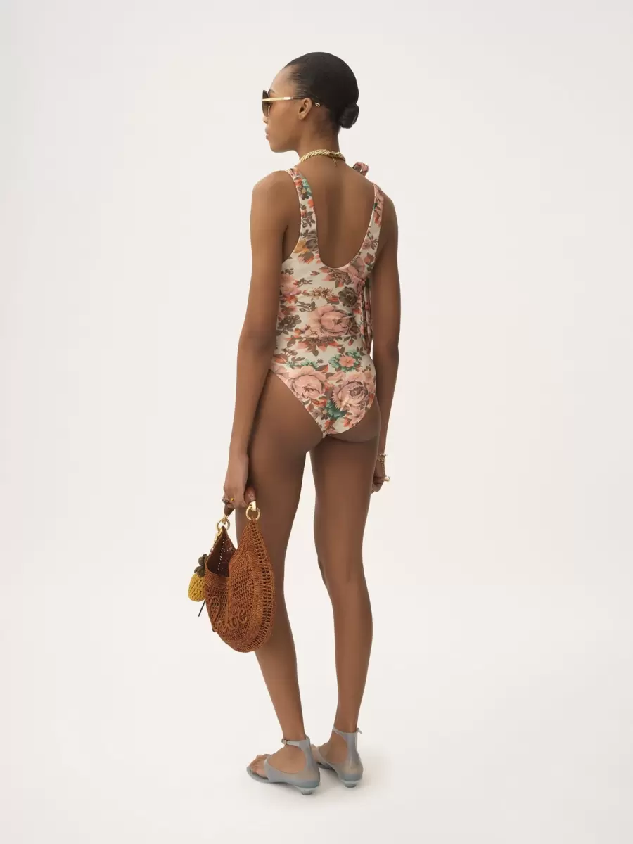Costume intero con scollo a barchetta in nylon elasticizzato lucido con stampa floreale all-over ispirata alla tradizione della Maison. La spallina destra è annodata sulla spalla, mentre il logo Chloé color oro impreziosisce il fianco sinistro.
