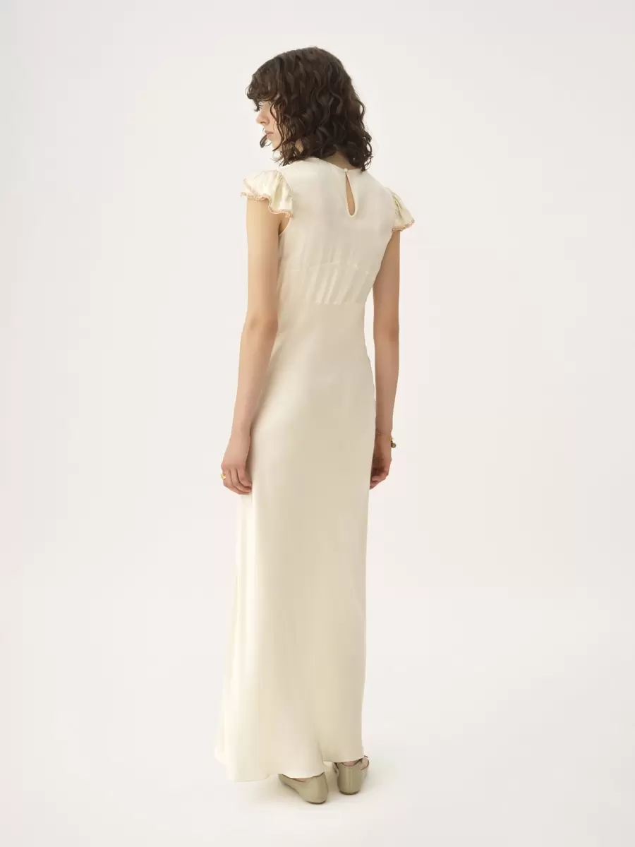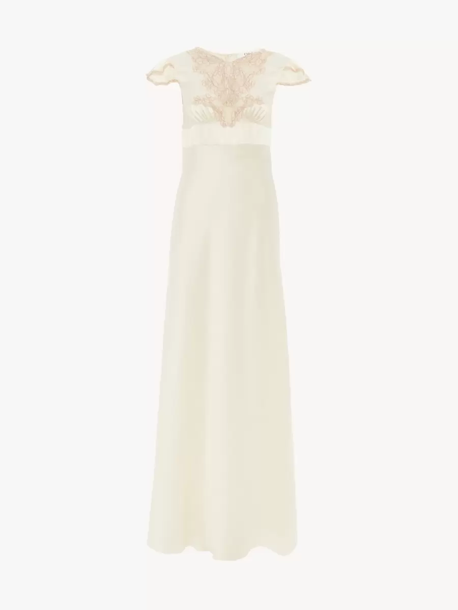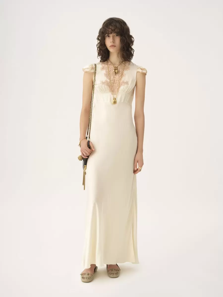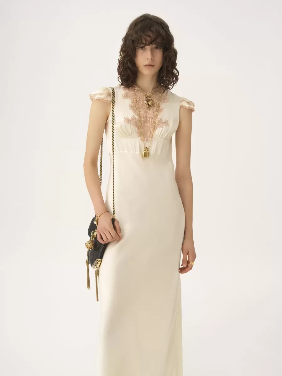Abito a colonna con maniche ad aletta in raso di seta lavato con inserti in pizzo, arricciato sul petto.